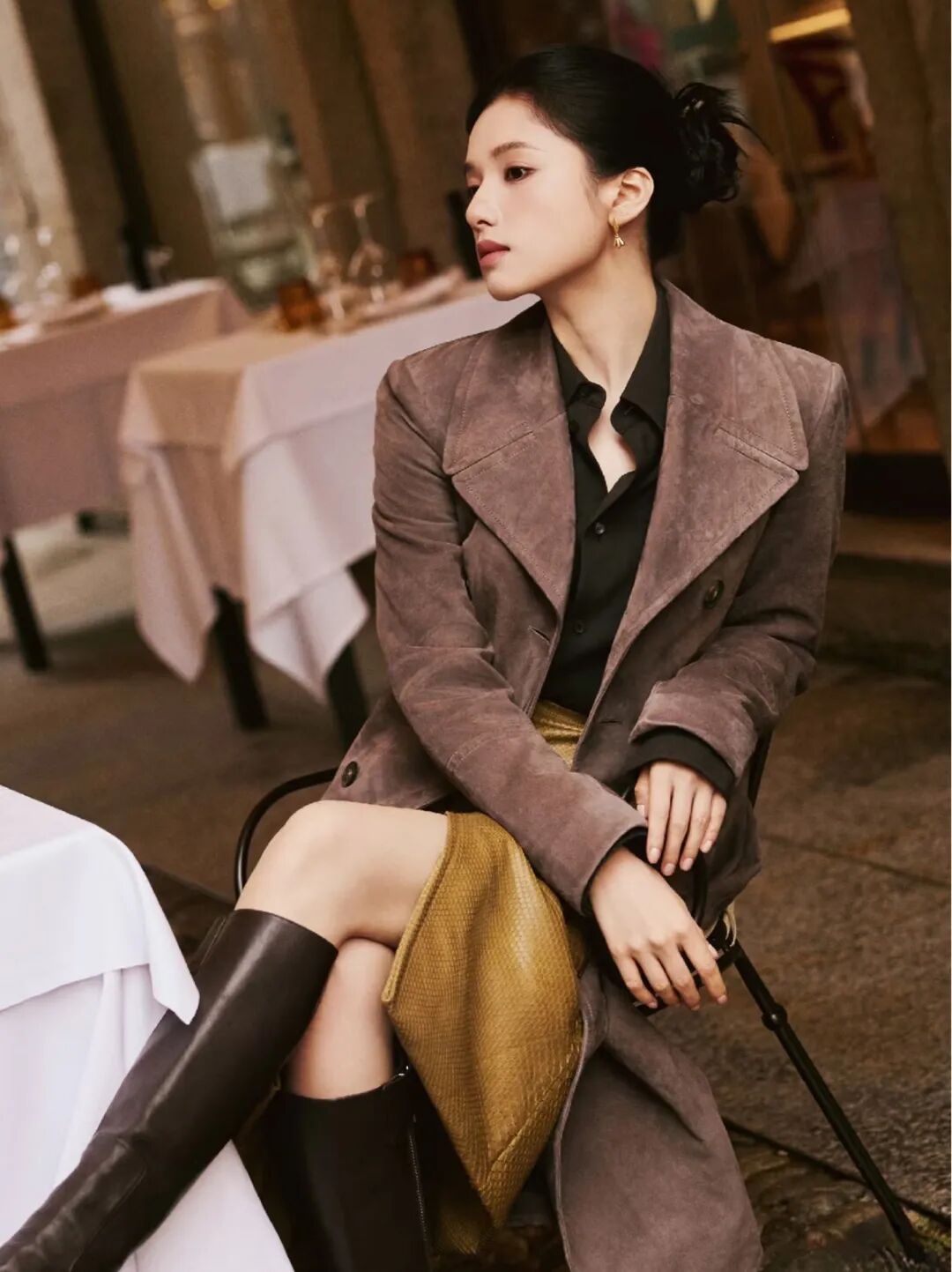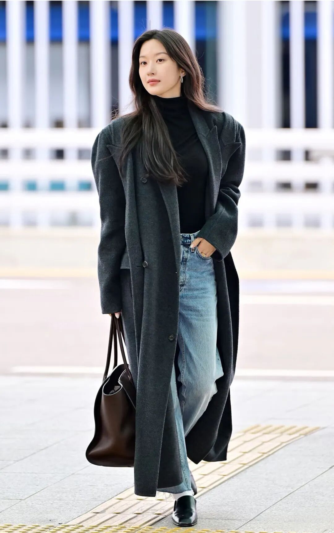 辛芷蕾的穿搭自带强大气场,利落的 H 型剪裁大衣搭配利落翻领,完美修饰肩颈线条,尽显干练姿态。内搭黑色高领针织打底,40 支精梳面料柔软贴肤,与大衣的挺括形成材质反差。整套深色 look 简约大气,酷感与质感兼具,是商务通勤的绝佳参考范本。