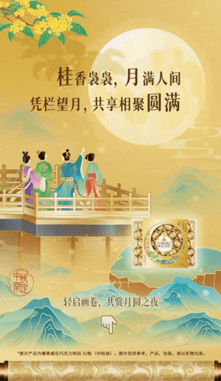 「点击向上拖拽」拉出画轴内容,旋转手机,「三层穿透式滑动」查看更多画面,月亮在滑动过程中时隐时现,与中秋节主题紧紧相扣。