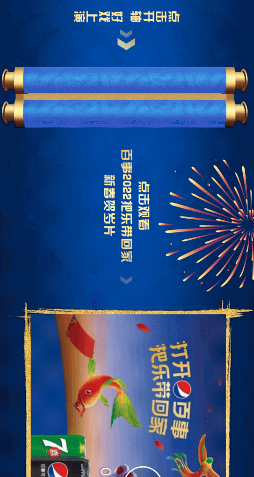 新年时分,「点击卷轴徐徐展开」揭示多位百事代言人为大家送上新春祝福,搭配中国风的设计和创意视频,年味满满,借此宣传自己的新春瑞兽罐。