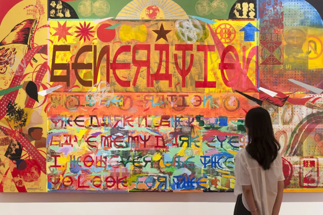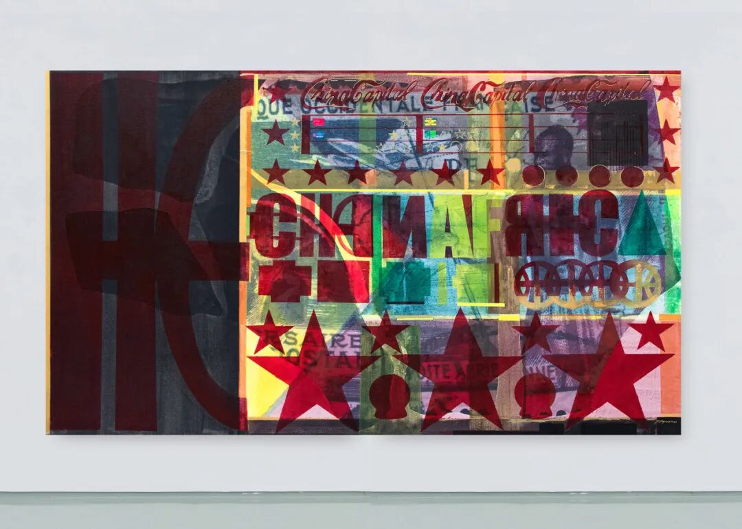 蒲英玮,《革命现实主义字体:现代性(中国与非洲)》,2019,布面油画、邮票、油漆笔、蜡笔、喷绘布印刷,120 × 200 cm