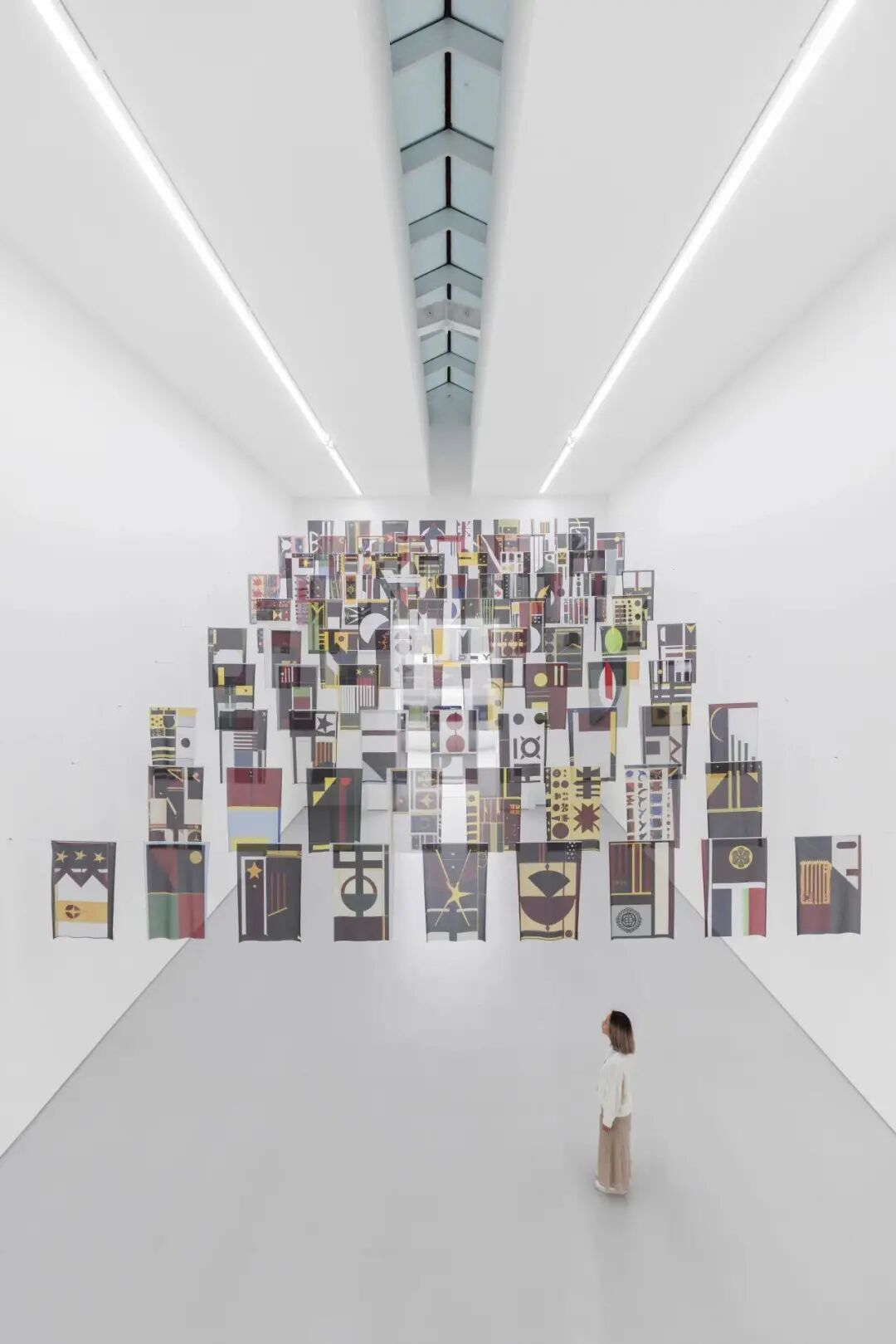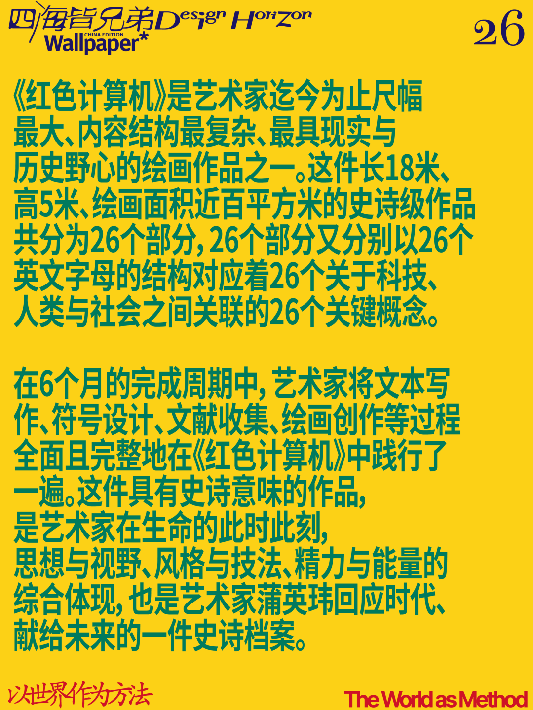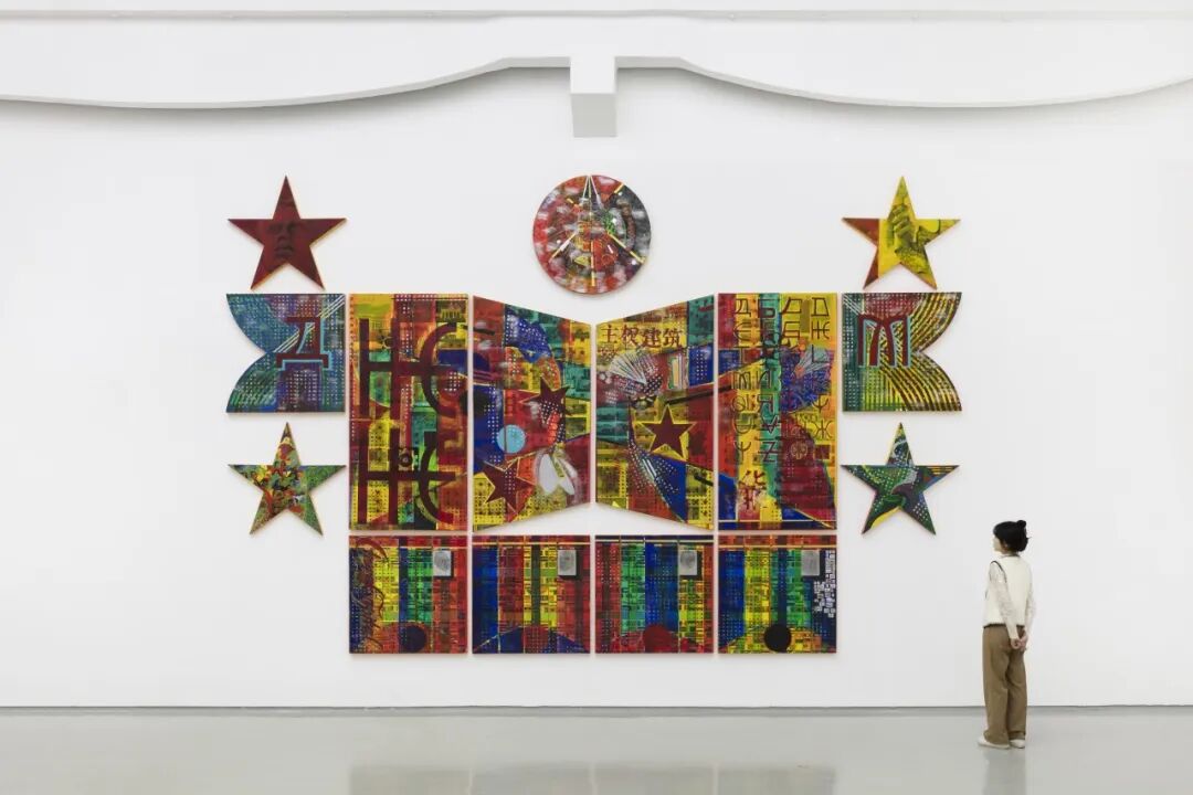 《红色计算机 / Red Computer》,2025,布面油画、亚克力、丝网印刷、纸本拼贴、宣纸、水墨,500 × 2000 cm,完整作品由26个部分组成,其中180 × 200 cm × 20个、100 × 300 cm × 6个