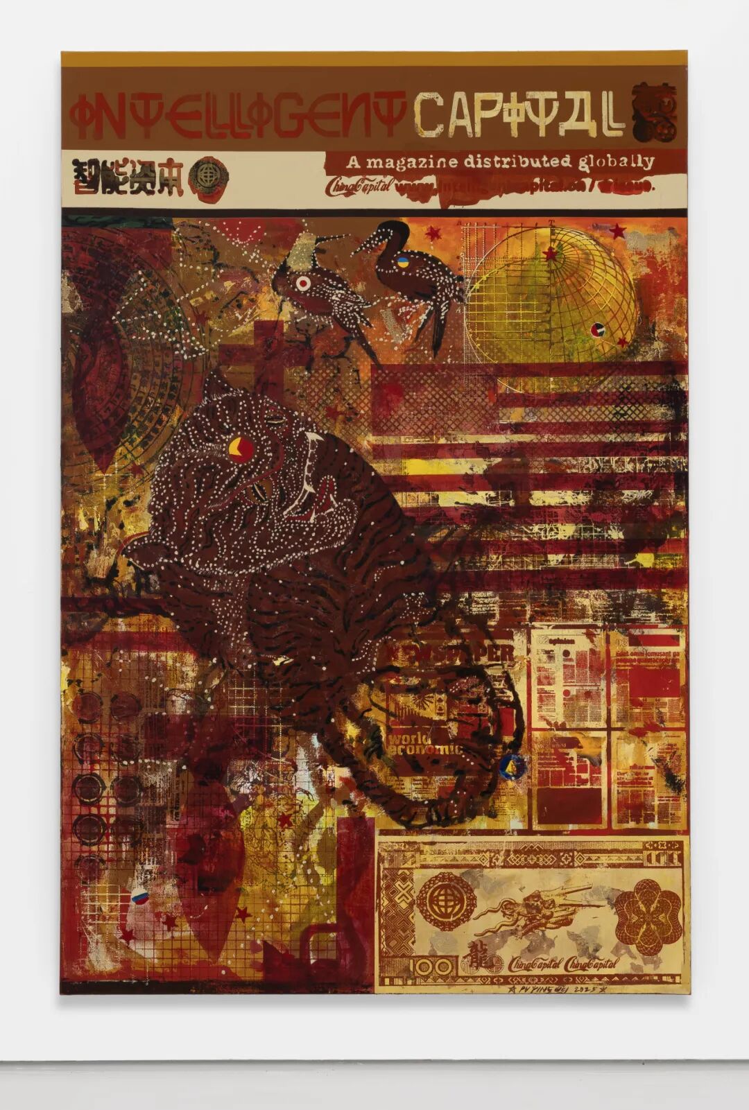 蒲英玮,《时局之谜》,2025,布面油画、丙烯、丝网印刷、金箔、色粉,180 × 120 cm