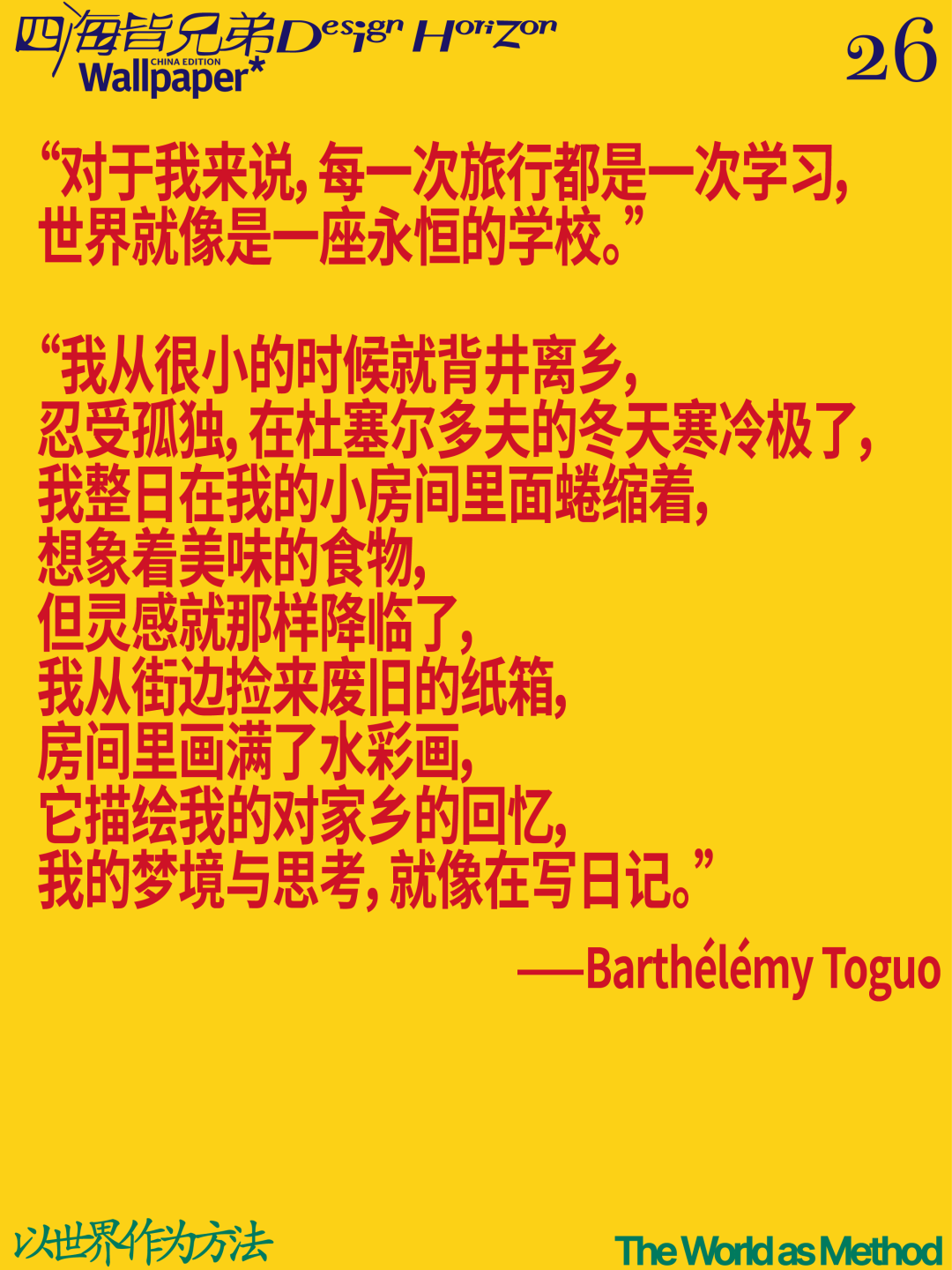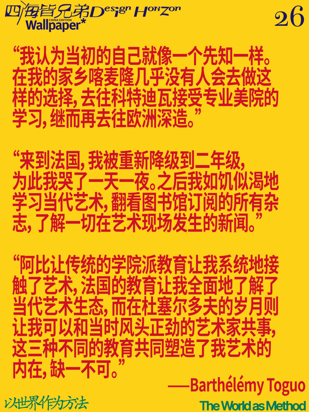 作为多次参加威尼斯双年展并且在世期间就进入卢浮宫中展出的当代艺术家,Toguo的故事开始于喀麦隆的姆巴尔马约城(Mbalmayo),一个美丽却又与当代艺术毫无关联的地方。Toguo的家族世代生活在那里,而年少时期的Toguo展现出超越其环境的远见,在结束了高中的学习之后,只身前往科特迪瓦,并在当地的阿比让美术学院接受了最初的系统化艺术教育。对于萌发艺术热情的少年Toguo而言,这是“造就无数非洲天才艺术家的摇篮”。而在学校的学习中,这座当初由法国人所建立的学院则延续了较为传统的欧洲学院派教学。“临摹,当时我们就是不断地去临摹伦勃朗、米开朗基罗等等。”Toguo这样说道。