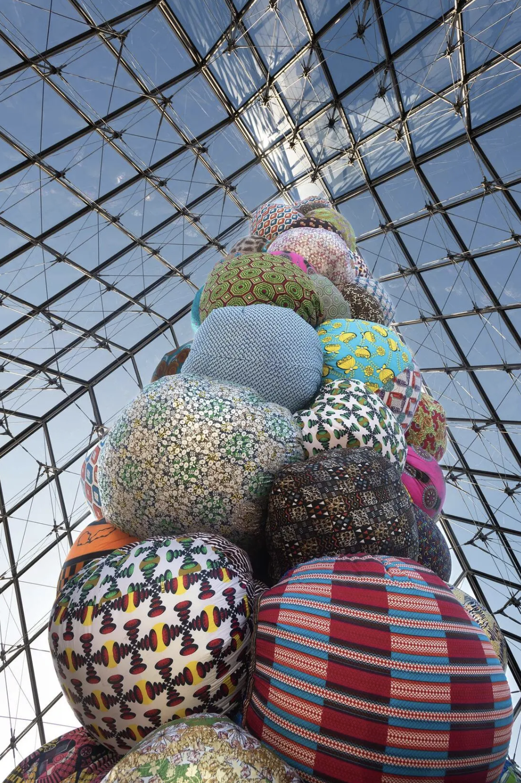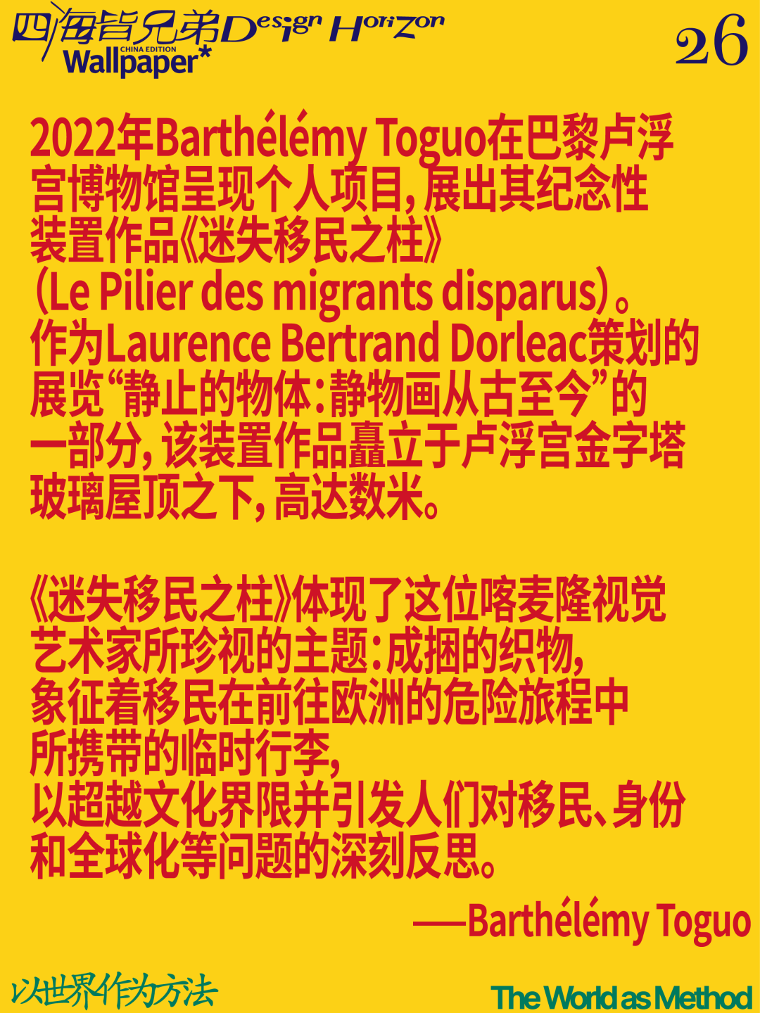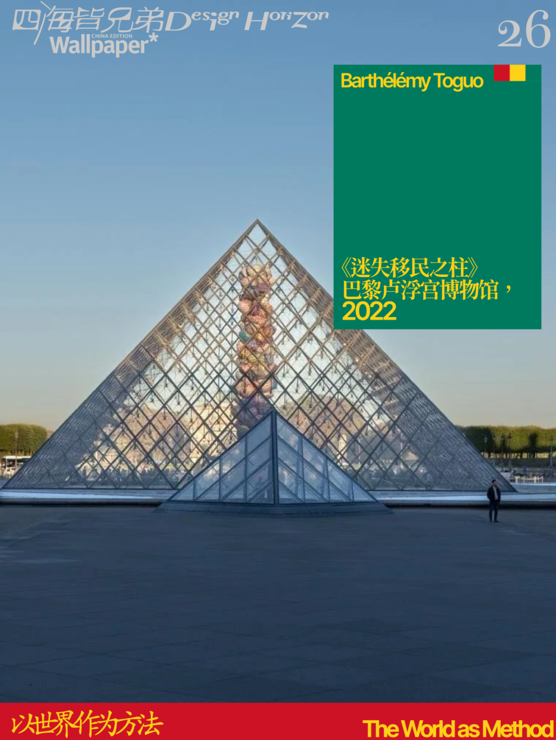 2021年,Toguo被任命为联合国教科文组织和平艺术家。次年,Toguo受法国卢浮宫委托创作了大型场域特定装置《迷失移民之柱》,作品位于巴黎卢浮宫透明金字塔下方。迄今为止,仅有五位艺术家曾在卢浮宫金字塔下举办展览,而Toguo是首位黑人艺术家。Toguo运用120个色彩斑斓的大型包裹汇聚成一座通天塔,象征着移民背负的行囊与苦难,凸显流离、生存与坚韧。
