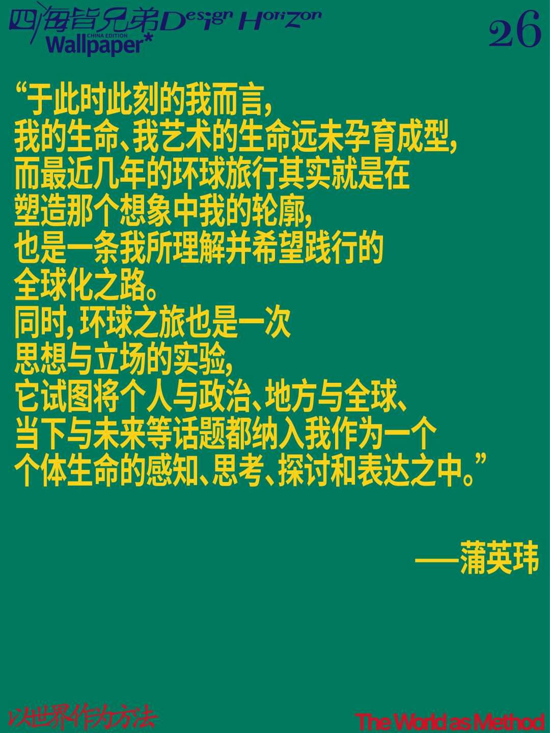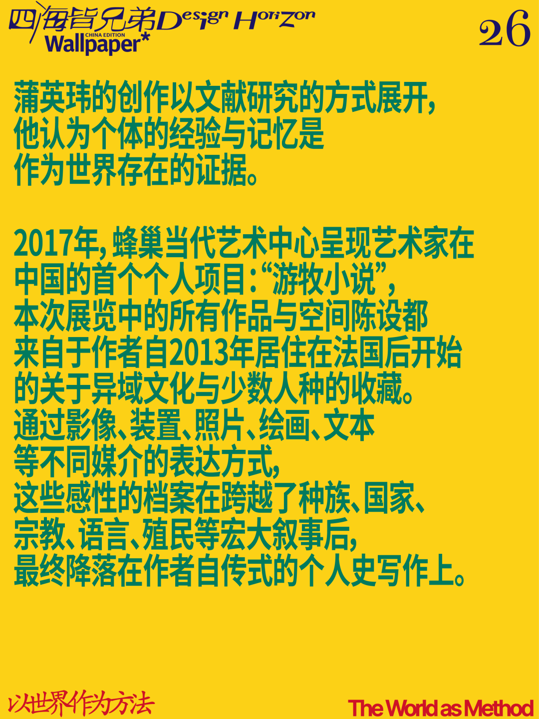 蒲英玮出生于1989年,2013年本科毕业于四川美术学院,2018年毕业于法国里昂国立高等美术学院,现工作生活于北京。他的作品涉及绘画、影像、设计、写作、讲演等多种媒介,开拓了以东方文明为认知基点的“新国际主义”艺术语言。