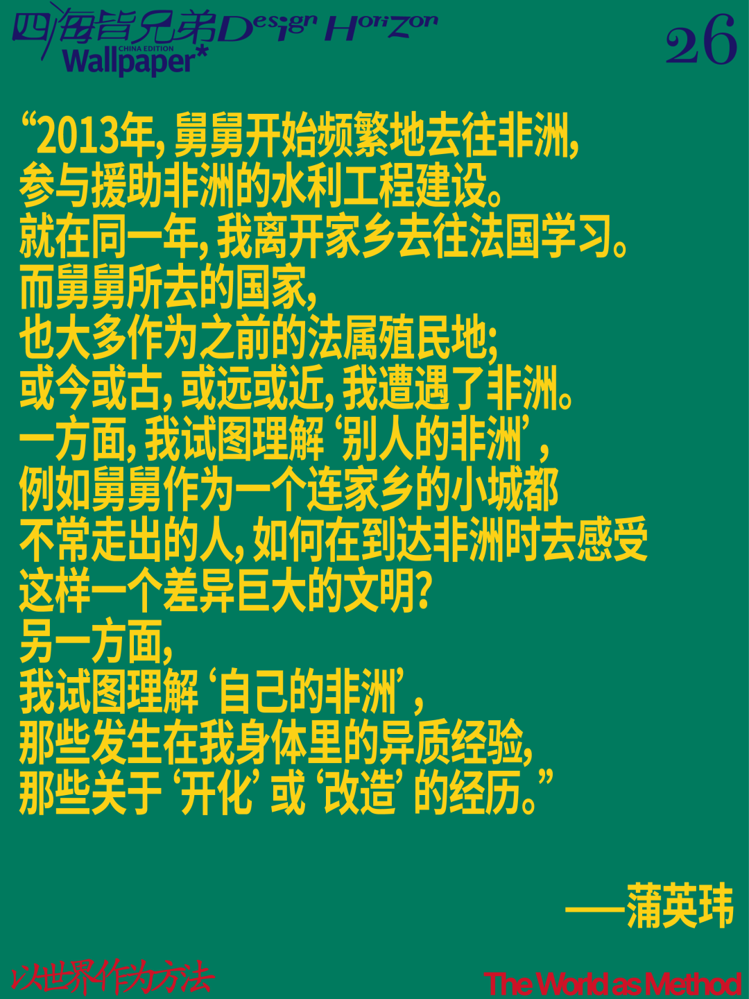 之后在其参加的“第十三届上海双年展:水体”上,蒲英玮便根据其对相关问题的理解,以及家人在援非工程中的真实经历,创作出了《水坝剧场》。而在新冠疫情结束以后,蒲英玮于2023年初到达肯尼亚的内罗毕,看到了《水坝剧场》中所说的中国工程队建造的水坝,以及水坝周围,依旧忙碌在其它工程之间、背井离乡的中国工程队们。