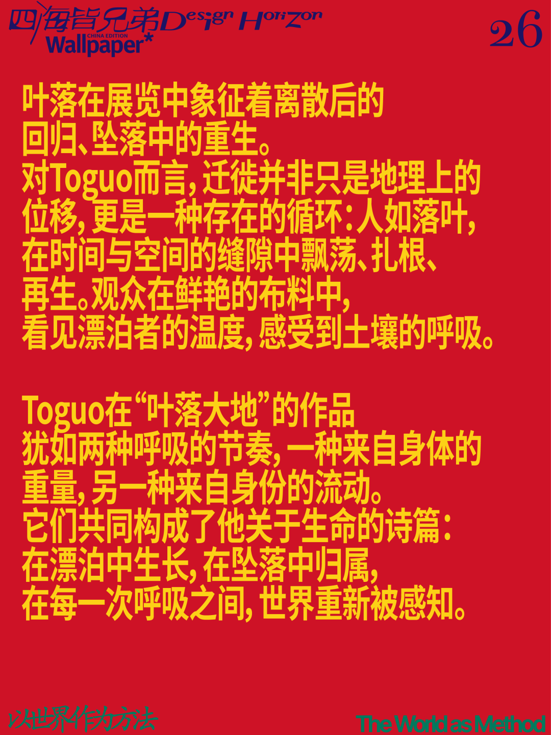 正如Toguo在与蒲英玮的对话中所说:“此时此刻,中国也有很多远走他乡的人。展览‘叶落大地’,既是送给他们的,也送给所有正在迁徙的人。”从非洲到中国,再到世界的不同角落,两位艺术家分别从各自的经验出发,讨论少数族裔、迁徙与身份,但这些议题并未停留在特定人群之中,而是逐渐扩展为一种更具普遍性的现实处境——关于离开、在场与重新建立关系的经验,最终指向的是所有身处流动之中的人。