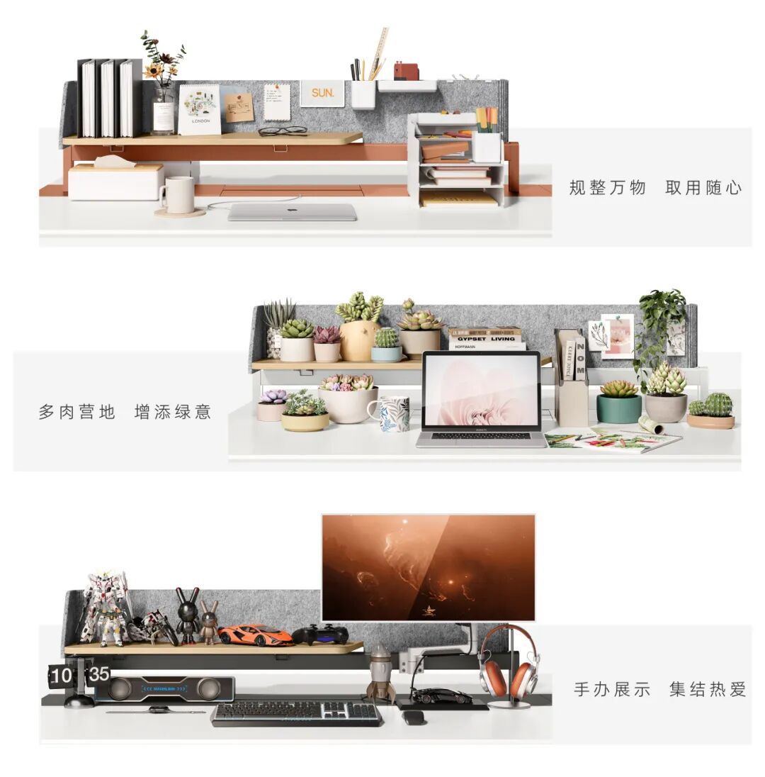 年轻人谁愿意工位千篇一律?桌边加个展示架,涂鸦、手办、多肉盆,工位成你的秀场。