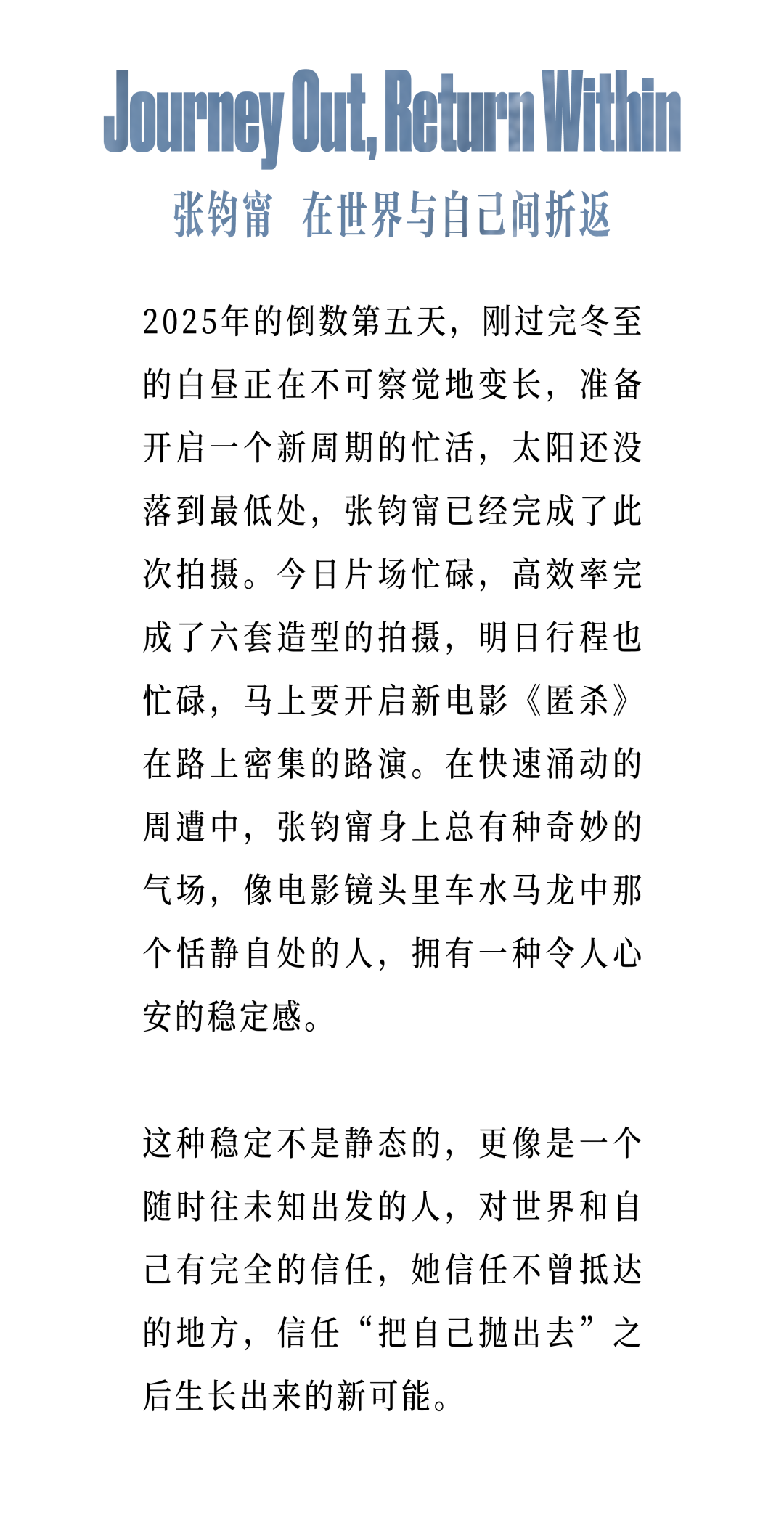 张钧甯会用这三个词,归纳褪去所有角色和社会身份后的「张钧甯」本身,像对宇宙伸出最清澈的拥抱——经历尽可能的多,然后用最本真的方式去消化它们。或许,张钧甯擅长的,并不是突破边界本身,而是在一次次进入未知之后,把世界扩展得足够大,大到可以容纳变化、矛盾、恐惧与热爱,也容纳一个人持续生长的无限可能性。如同一场持续“拓张—回归”的实验,不断走向更远的地方,却始终带着一颗愿意在草地上打滚的心回来。