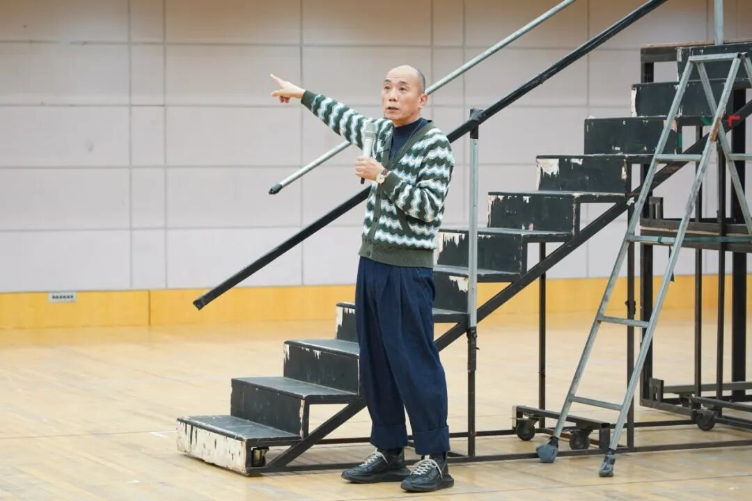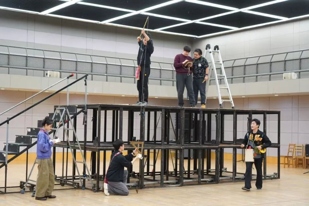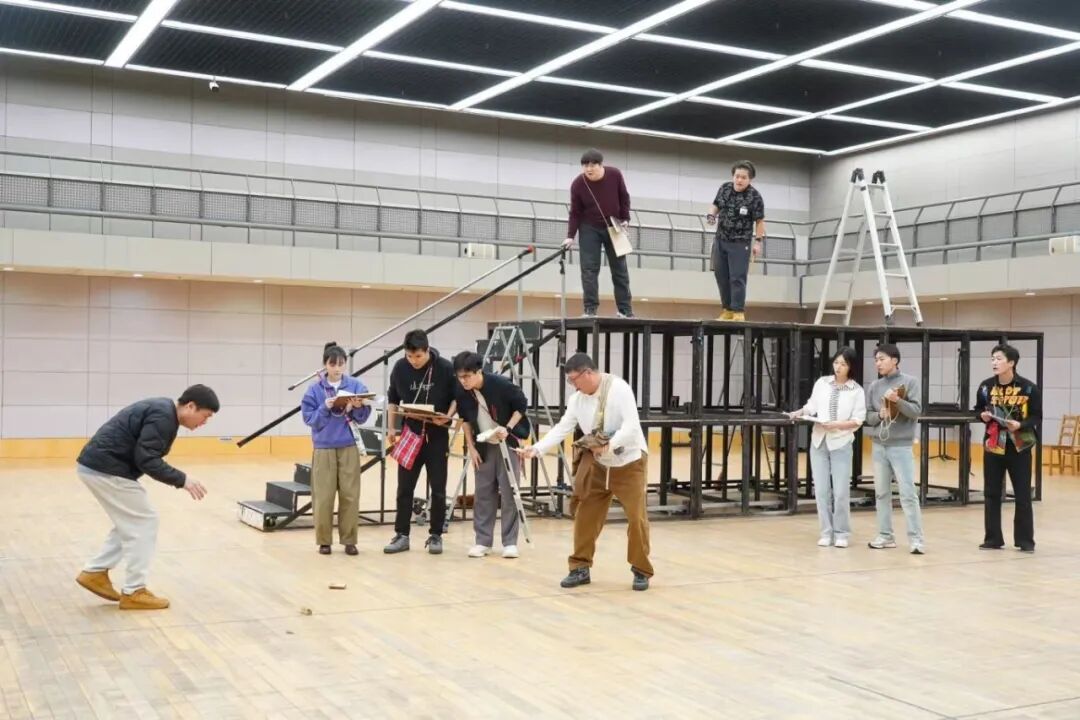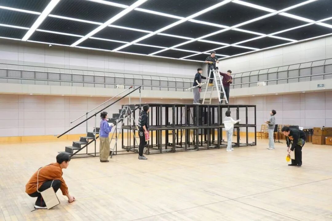 排练厅内,模拟测绘现场的杉木高架拔地而起,来自不同地域背景的测绘队员们攀上高架,展开严谨而专注的测量作业。该剧的舞台设计通过巧妙的视觉构思,精准提炼并呈现了人与建筑局部之间的空间与情感关系,令现场观者对舞台上的最终呈现充满期待。