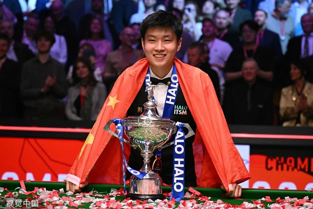 当地时间2025年5月5日,英国谢菲尔德,2025斯诺克世锦赛决赛第四阶段比赛结束,中国选手赵心童总比分18比12战胜马克·威廉姆斯夺得冠军,成为中国首位,也是亚洲首位斯诺克世锦赛冠军,创造了斯诺克运动的历史。Oli Scarff/AFP/摄