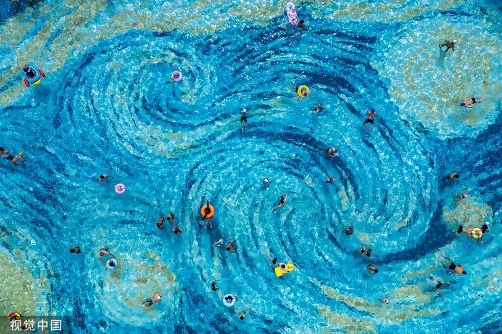 2025年6月21日,成都,民众在江滩公园梵高星空泳池中娱乐避暑。该游泳池池底被装饰成梵高油画作品《星月夜》里的“星空”,市民畅游其中,从空中俯瞰,别有一番趣味。Ptbye/摄