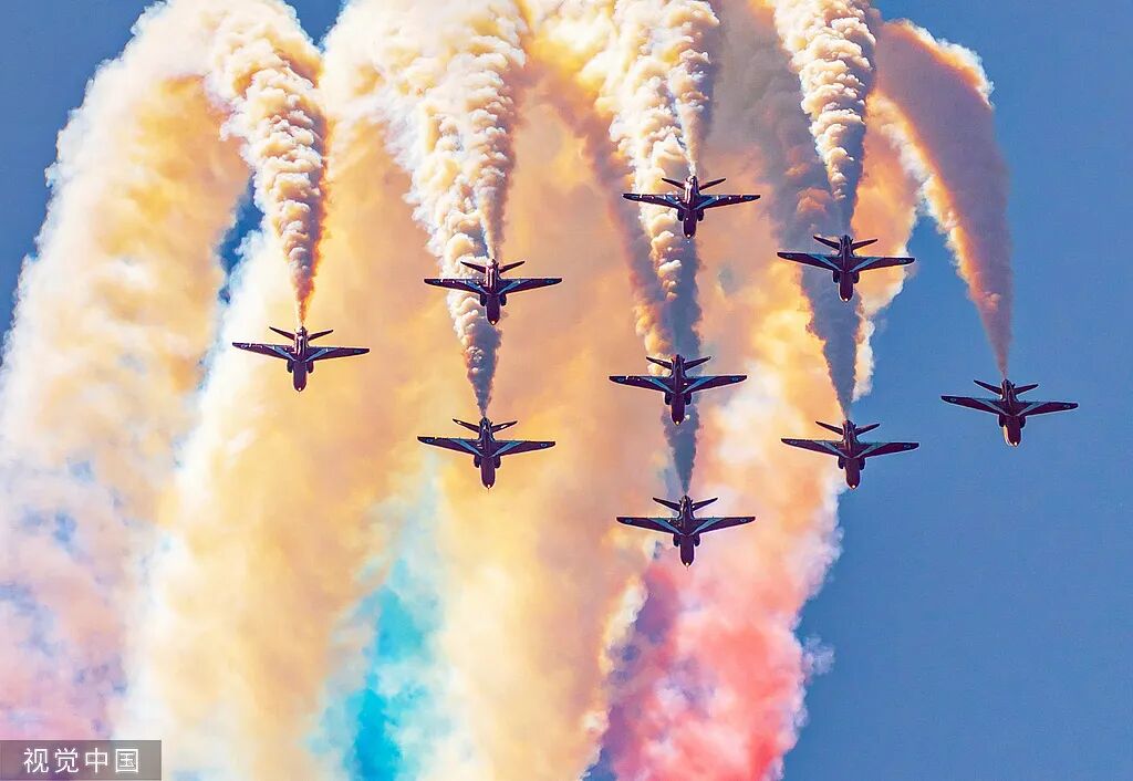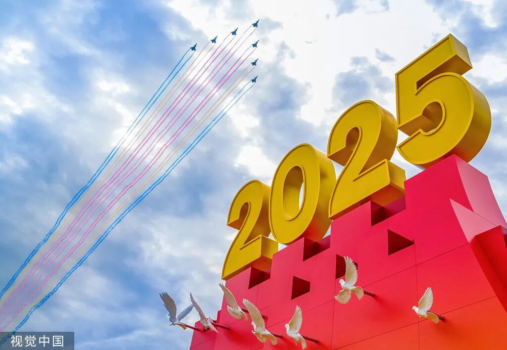 2025年9月3日,北京,纪念中国人民抗日战争暨世界反法西斯战争胜利80周年大会在天安门广场隆重举行。空中梯队飞过天安门广场年号台。孙楠/摄