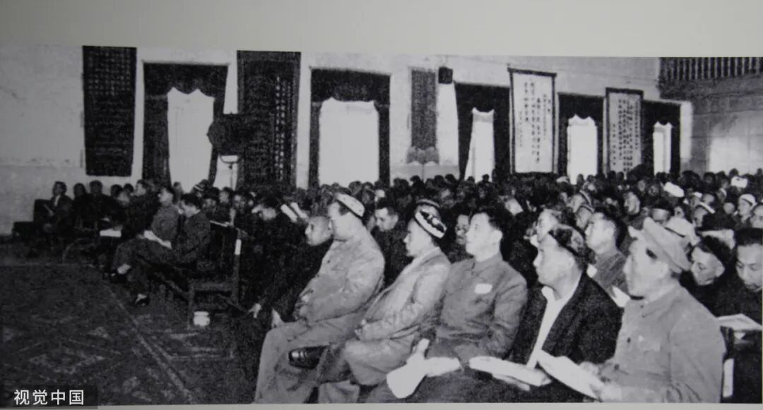 1955年,新疆维吾尔自治区成立大会会场。会议选举赛福鼎·艾则孜为自治区主席,并通过了相关决议。2025年是新疆维吾尔自治区成立70周年。张庆民/摄
