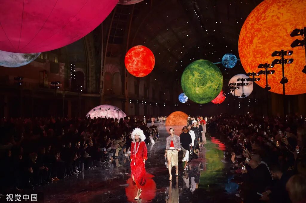 当地时间2025年10月6日,法国巴黎,2026春夏巴黎时装周,马修·布拉齐接任香奈儿创意总监后的首场大秀,模特走在以"宇宙"为主题的T台上,被星光月影环绕。Franck Castel/ABACA/Newscom/摄