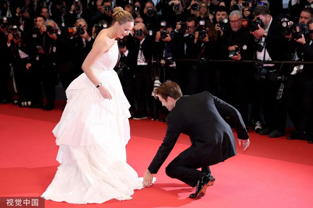 当地时间2025年5月17日,法国戛纳,第78届戛纳电影节,《去死吧,我的爱》首映红毯,主演罗伯特·帕丁森屈身为詹妮弗·劳伦斯整理裙摆。除了新片上映,詹妮弗·劳伦斯还获得了第73届圣塞巴斯蒂安国际电影节终身成就奖,成为该奖项历史上最年轻的女性获奖者。Sameer Al-Doumy/AFP/摄
