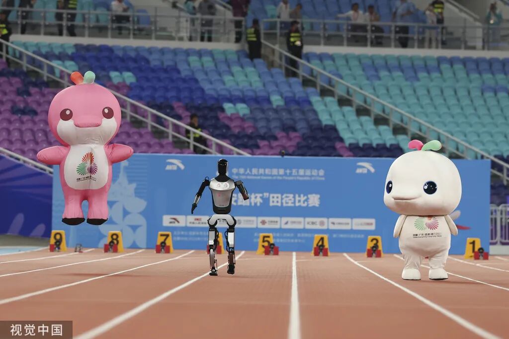 2025年11月17日,广东深圳,2025全运会田径项目多项赛事在广东省奥体中心体育场举行。女子100米复赛开赛前,吉祥物“喜洋洋”“乐融融”与机器人为观众上演了一场百米赛道趣味竞速赛。而这场“对决”背后,是近年来中国机器人技术、AI终端应用等前沿科技的迅速发展和广泛应用。Zhe Ji/Getty Images/摄