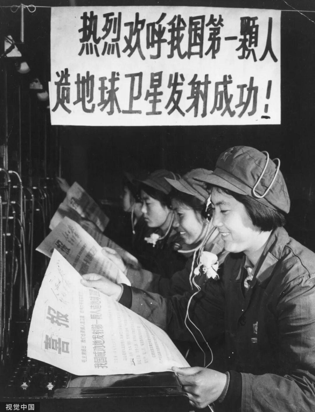 1970年4月24日,中国成功发射了第一颗人造地球卫星“东方红一号”,这是中国航天史上的重要里程碑。图为电话接线员们在工作时看报纸,为中国第一颗人造地球卫星“东方红一号”发射成功欢喜。2025年4月24日是我国第一颗人造地球卫星“东方红一号”发射成功55周年,也是第十个“中国航天日”。Keystone/Getty Images/摄