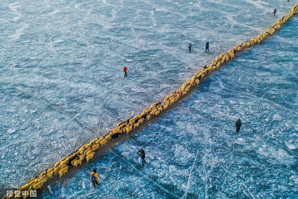 2025年2月7日,西藏山南,浪卡子县推瓦村的羊群通过普莫雍错冰湖,前往湖心岛。推瓦村是世界上海拔最高的行政村,以牧业为主。由于海拔高,草场无法为羊群提供充足的过冬饲料。因此,每年高原最冷的时候,推瓦村牧民会把羊群赶到普莫雍错水草丰茂的湖心岛,依靠岛上的草料度过寒冷的冬期。中新社记者 贡嘎来松/摄