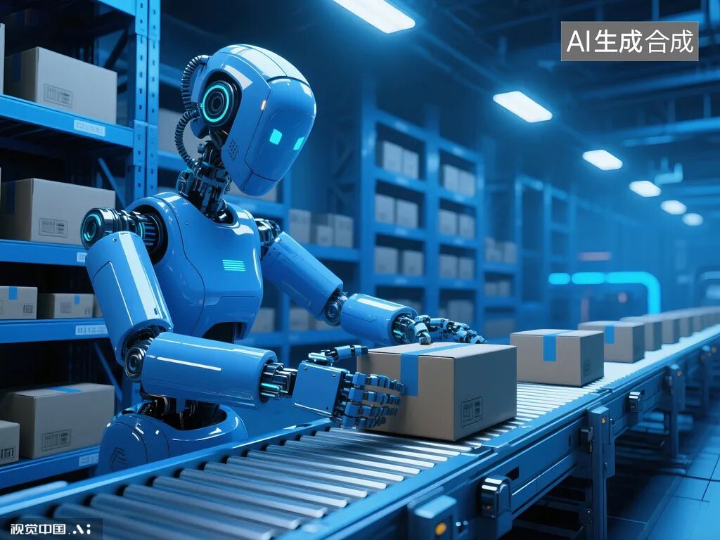 人形机器人立于仓储传送带旁,灵活操控机械臂处理纸箱,周围是码放着货物的蓝色货架与延伸的输送线。2025年是我国人形机器人规模化量产元年,头部企业实现千台级交付。刘旭旭/供