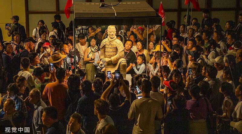 2025年9月14日,西安,在秦始皇兵马俑博物馆二号坑,游客正在观赏跪射俑。跪射武士俑的塑造比起一般的陶俑要更加精细,对表情神态和发髻、甲片、履底等的刻画生动传神,并且文物原本的彩绘保存状况完好,真实表现了秦军作战的情景。袁景智/摄
