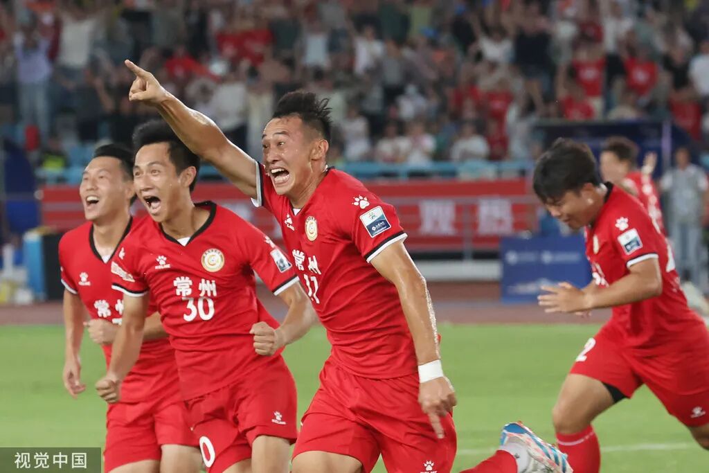 2025年8月16日,江苏常州,2025江苏省城市足球联赛(苏超)迎来焦点之战,此前八轮比赛零胜的常州队主场对阵镇江队,在全场四万多名观众的助威下,最终,常州队以1比0战胜镇江队,取得首场胜利。图为常州队球员赵连平(左三)进球后庆祝。中新社记者 泱波/摄