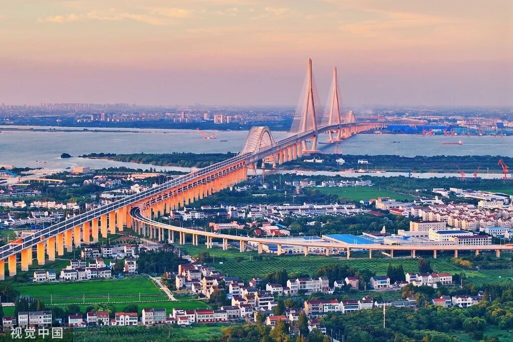 2025年7月29日,江苏常州,常泰长江大桥呈现出“金光穿洞”的美景。9月9日,大桥正式通车。这是一条公铁合建双层复合型过江通道,历时6年打造而成,创下了最大跨度斜拉桥、最大跨度公铁两用钢桁梁拱桥的世界纪录。吴树建/摄