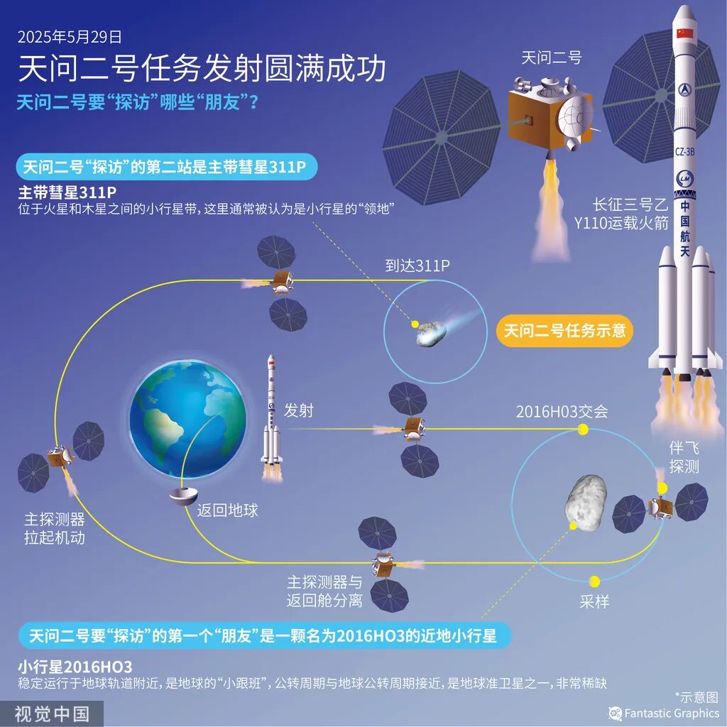 天问系列是中国行星探测系列任务名称,主要目标是实施以火星探测为重点的行星探测工程。天问二号任务总周期约10年,包含13个飞行阶段。前两年半实施对小行星2016HO3的伴飞、附着取样,目标获取100克以上样品并于2027年底返回地球。奇图文化/供