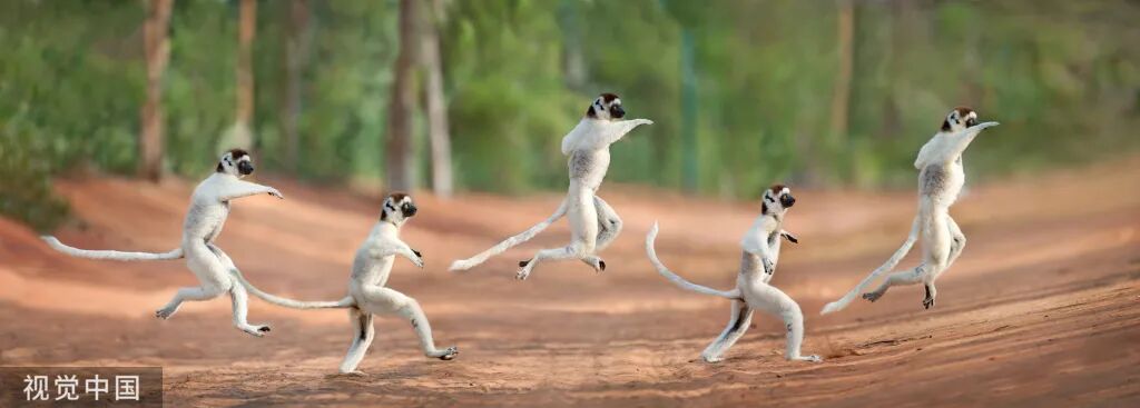 当地时间2025年,马达加斯加贝伦蒂自然保护区,(合成图)狐猴在沙漠间蹦跳腾挪,仿佛在一展 “舞蹈绝技”。马达加斯加是世界第四大岛,面积近60万平方公里,与世隔绝的自然环境为这里造就了许多特有的生物种类,狐猴就是其中最有特点的代表之一。Dale Morris/Solent News/摄