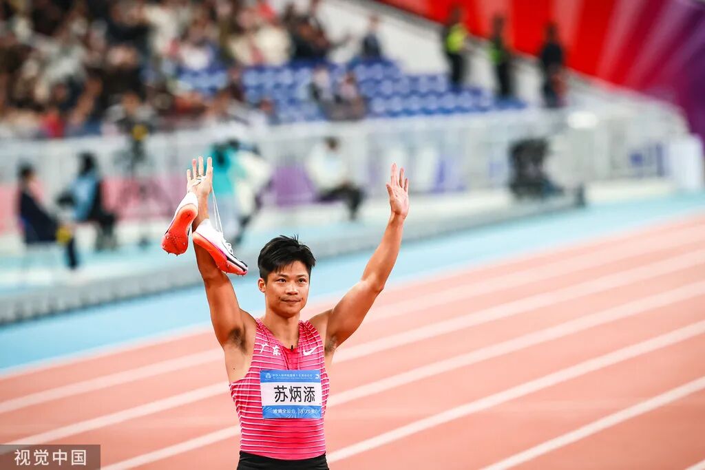 2025年11月20日,广州,2025全运会田径男子4x100米接力决赛,由“亚洲飞人”苏炳添领衔的广东队以38秒71夺得第四名。赛后,苏炳添高举跑鞋向观众致意,在掌声中完成谢幕之战。时龚/摄