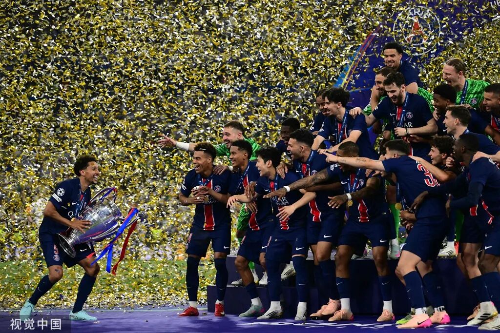 当地时间2025年5月31日,德国慕尼黑,24/25欧冠决赛,巴黎5-0国米,夺得队史首座欧冠冠军奖杯的同时成就赛季四冠王。赛后,马尔基尼奥斯举起奖杯与全队庆祝胜利。Marco Bertorello/AFP/摄