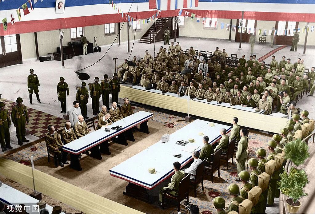 1945年9月9日,中国战区日军投降签字仪式在南京中央陆军军官学校大礼堂举行,右边大桌为中方代表,左边大桌为日方代表。侵华日军代表冈村宁次等在投降书上签字,向中国政府投降。仪式标志着中国战区对日作战的全面胜利。2025年是中国人民抗日战争暨世界反法西斯战争胜利80周年。(数字彩色复原技术)秦风老照片馆/供