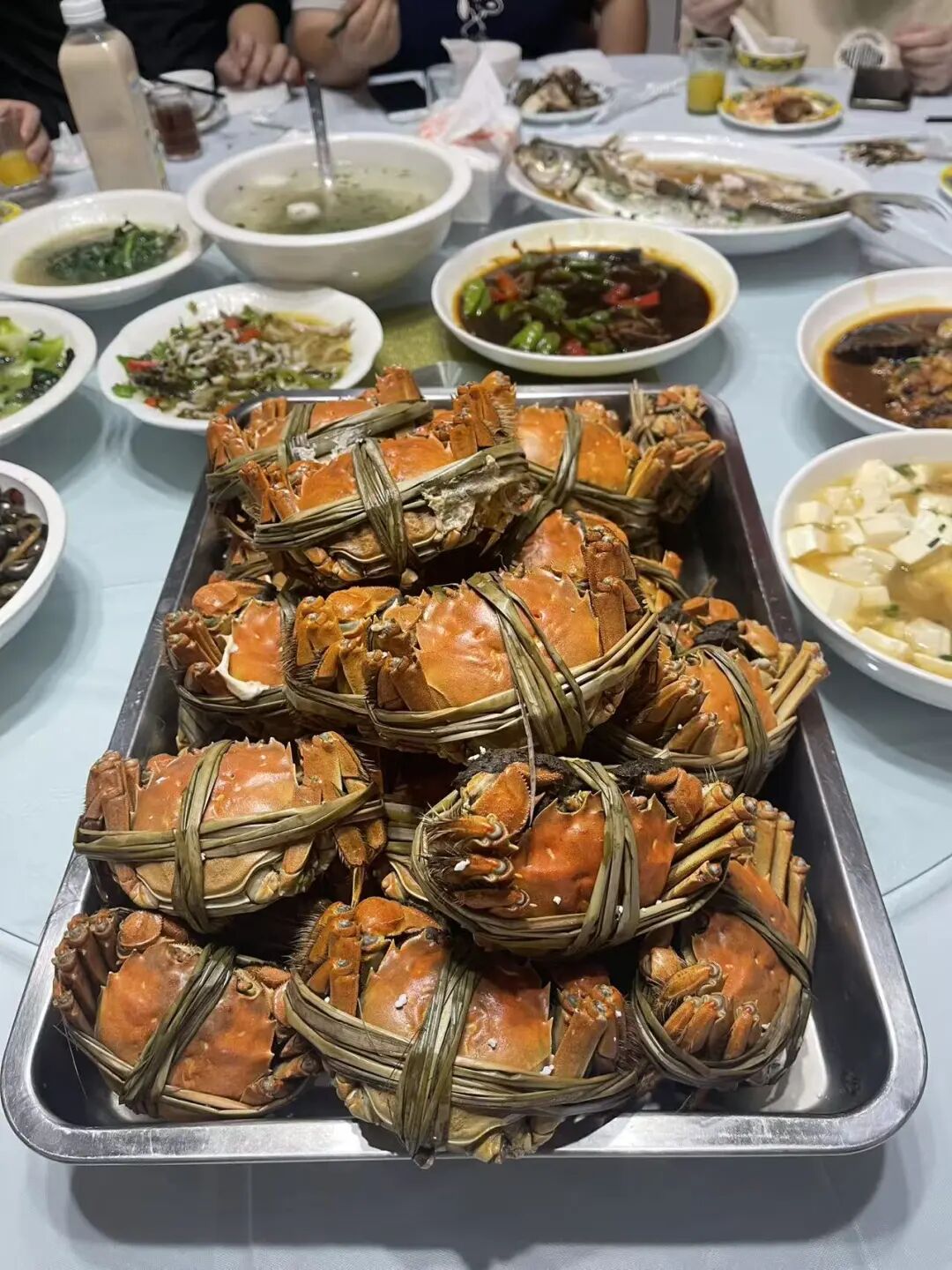 晚餐桌上,清蒸大闸蟹冒着热气!橙红蟹壳掰开满是膏黄,蘸点姜丝醋,鲜得人眯起眼。伙伴们边剥蟹边聊,笑声混着蟹香,成了湖光里最鲜的记忆。