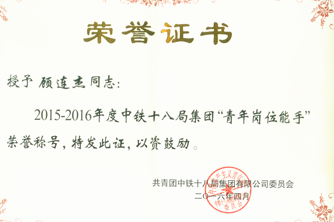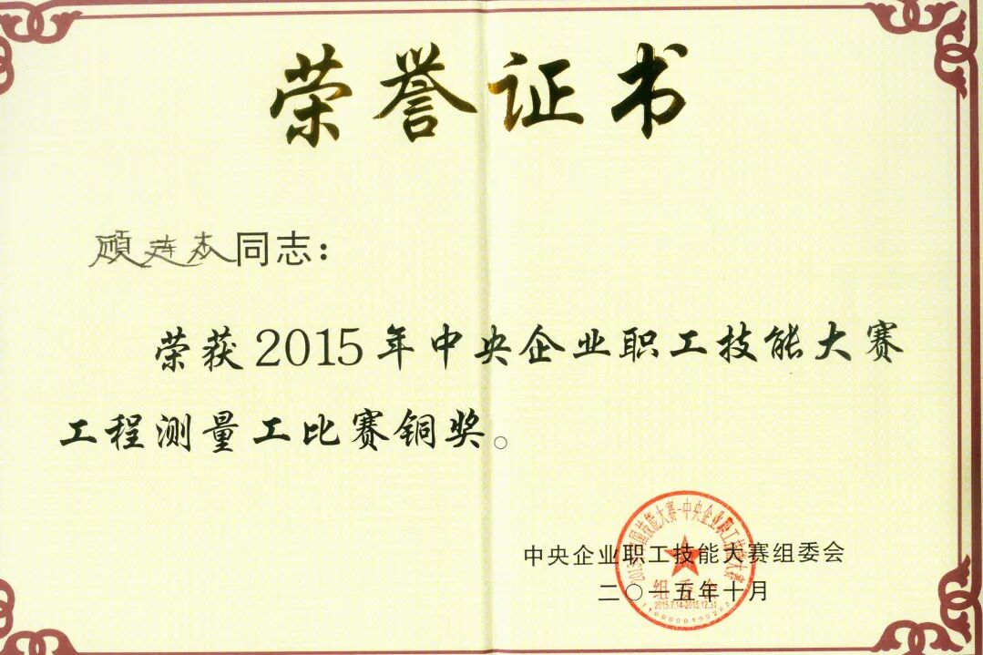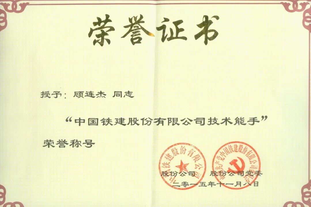 2015年,顾连杰代表中国铁建参加中央企业工程测量工技能大赛。历经百日选拔,他从17家单位96名选手中脱颖而出,跻身全国十强。训练期间,他每日负重奔跑超10公里,以秒表严控训练精度。最终在全国35家央企、166名高手中再创佳绩,勇夺铜奖,被国资委授予“中央企业技术能手”,同年获得中国铁建“技术能手”和集团公司“青年岗位能手”。