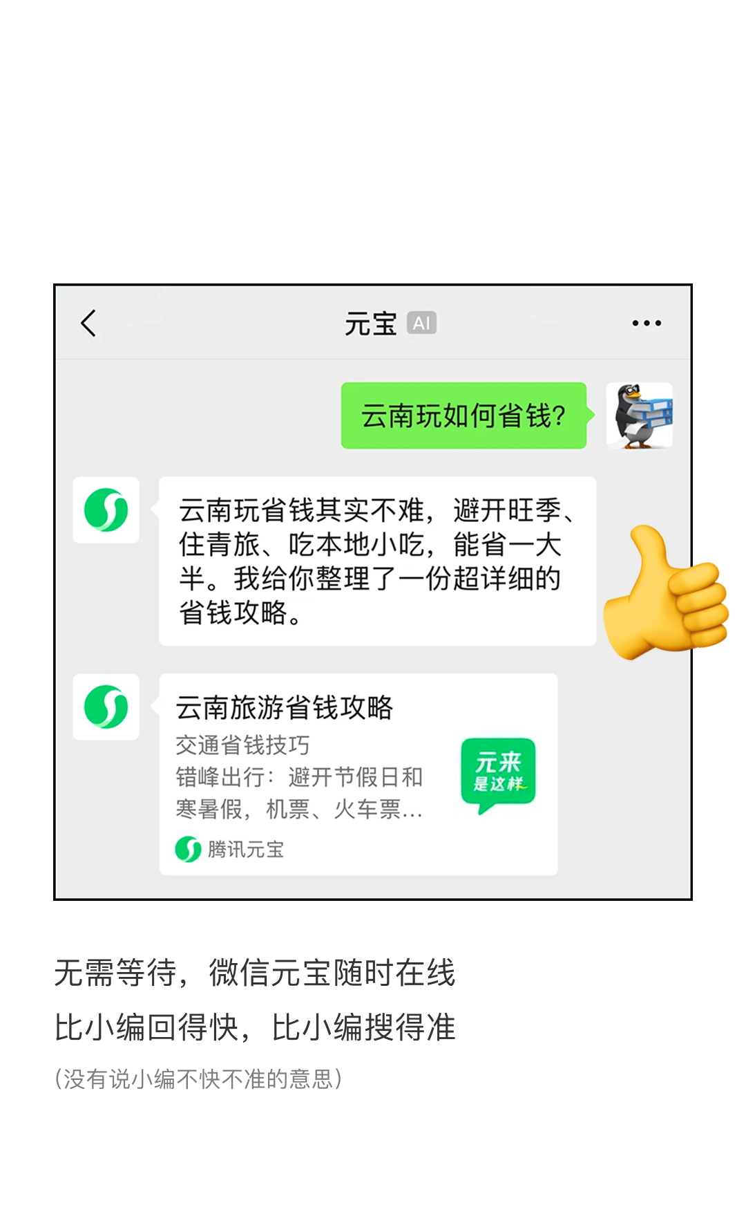 好了,今天的《元宝小编自救指南》《元宝使用说明书》就到这里,总结一下: