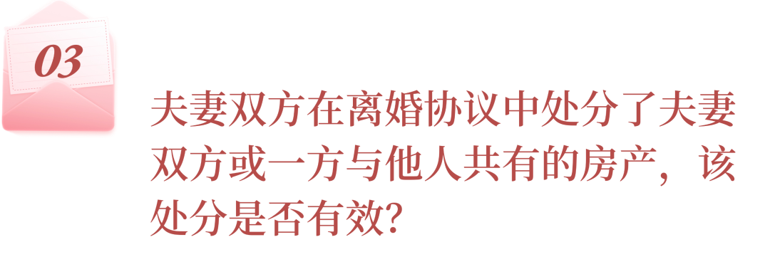 离婚时,原则上夫妻双方仅有权处分夫妻个人及共有财产。夫妻双方在离婚协议中虽然处分了夫妻双方或一方与他人共有的房产,但若双方仅处分了该房产中属于夫妻双方或一方所有的财产份额,而未处分他人财产份额的,则该约定有效。反之,若夫妻双方在离婚协议中处分了他人在共有房产中的财产份额,且事先或事后也未征得该产权人同意或者追认,则夫妻双方处分他人财产的行为系无权处分,对该产权人不具有法律约束力。