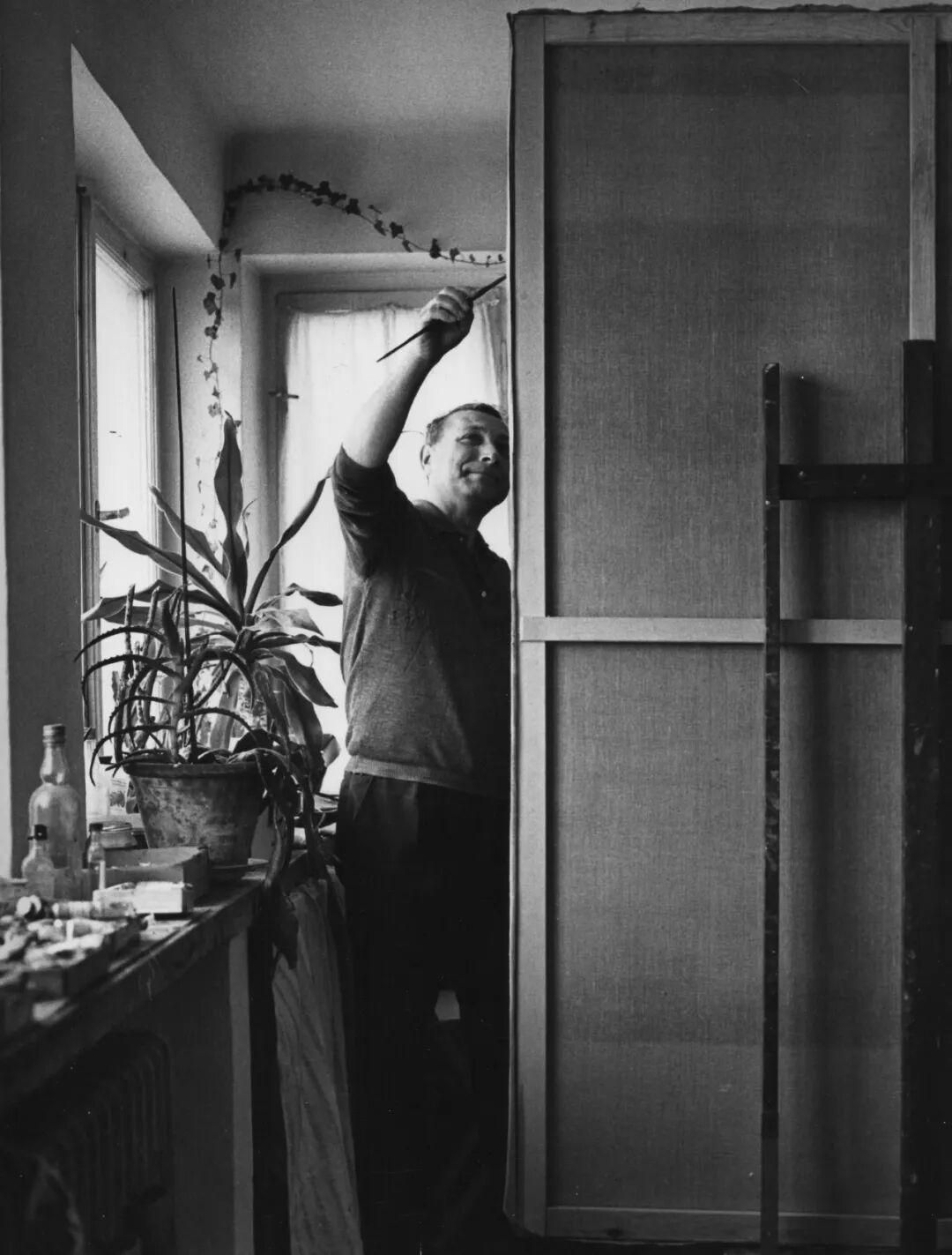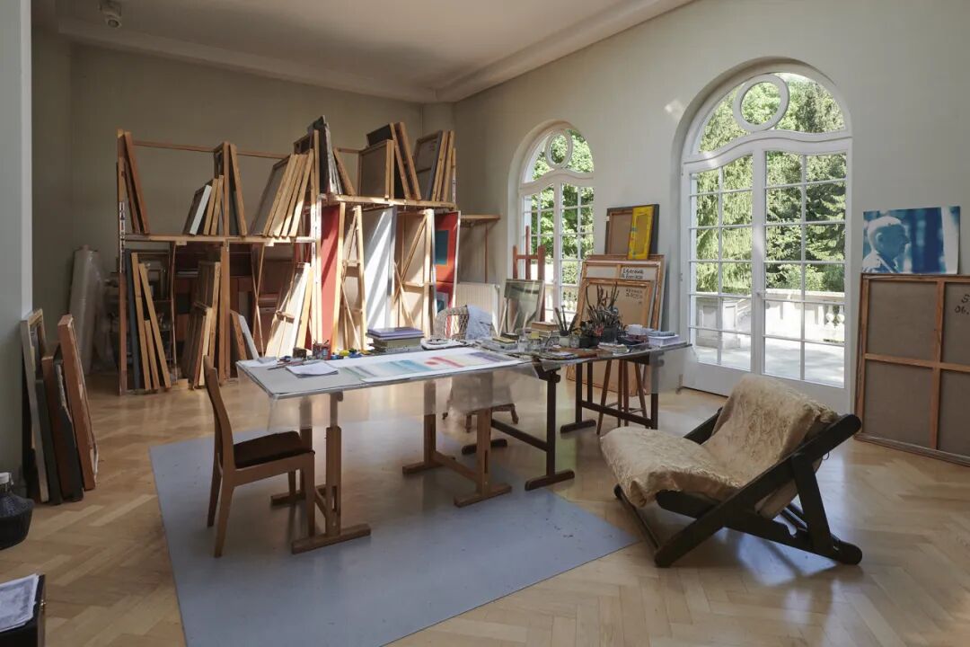 Stefan Gierowski 在波兰华沙的工作室内部。木质地板与画架很和谐地充满了整个空间。落地的玻璃门窗让自然随时浸入,舒适且开阔。