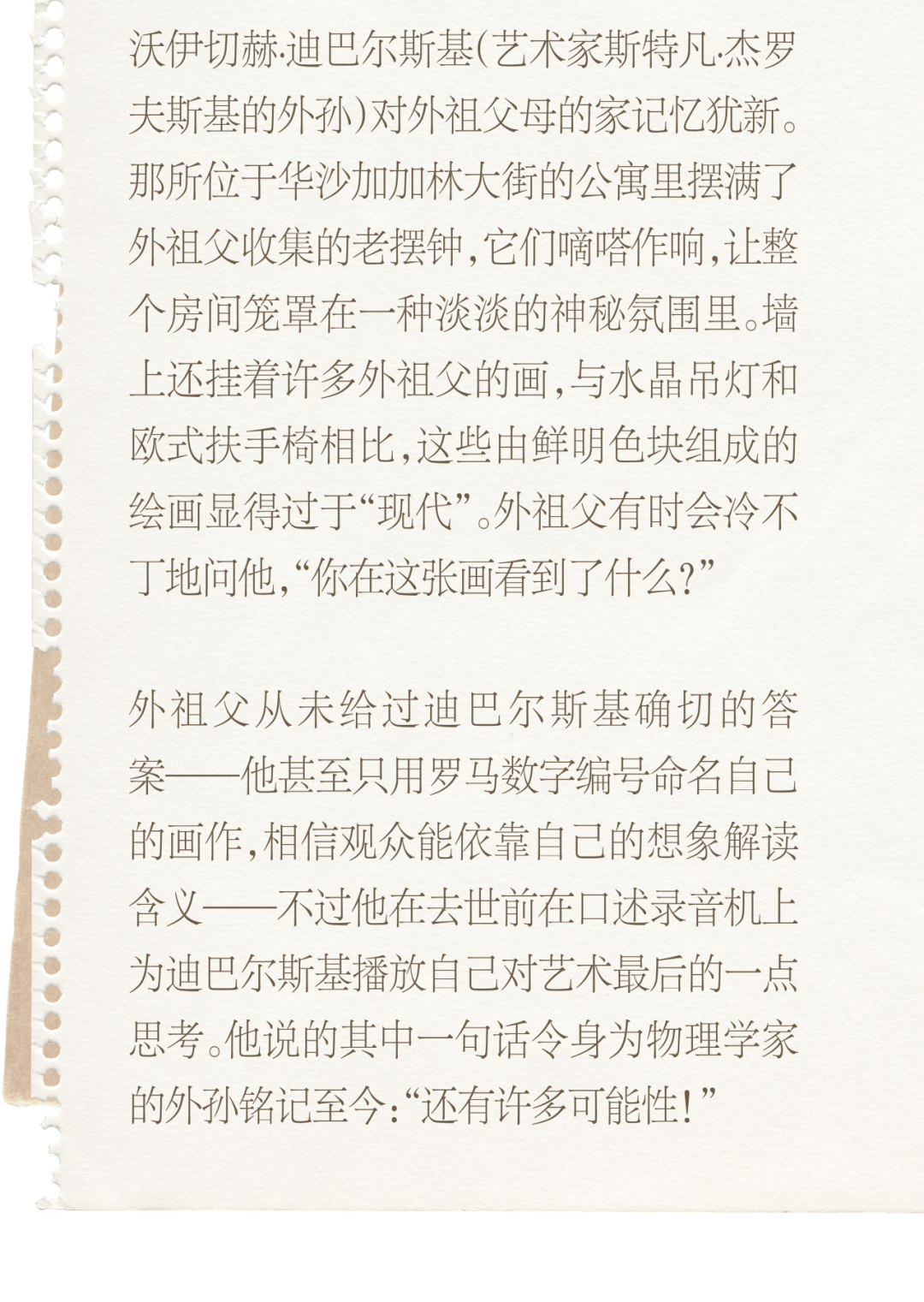 据迪巴尔斯基回忆,成长过程中他发现物理学是他与外祖父之间的共同语言,我意识到他对艺术的理解非常理性,通常基于科学的假设,尤其是物理学领域对光(其本质是一种电磁波)和颜色的定义。在加加林大街外祖父床头的书架上躺着许多相关领域的专著,这些书在我后来正式开始学习物理学的时候都曾翻阅过,其中既包括老派的色彩学理论专著,量子力学史,费曼的量子电动力学讲座,也有关于光和物质的现代理论。这些书和墙上外祖父的画彼此呼应:有些画让我想起震颤的镭射激光束,另一些则像是宇宙射线在气泡室中留下的痕迹。”