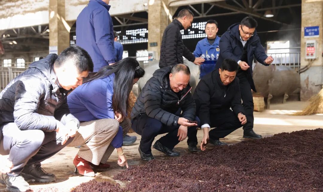 △天富生态酿酒区内,汪俊林董事长一行查看糟醅发酵情况、品评新酒