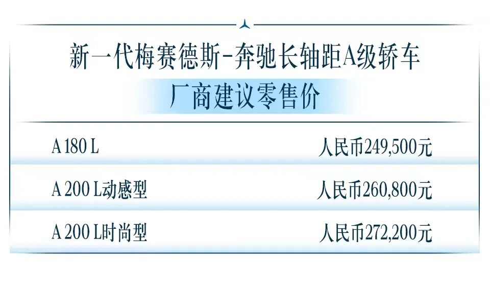 愈年轻,愈偏爱。今日,新一代梅赛德斯-奔驰长轴距A级轿车上市,提供A 180 L、A 200 L动感型、A 200 L时尚型三款车型,厂商建议零售价区间为人民币24.95万元至27.22万元。自2018年上市以来,梅赛德斯-奔驰长轴距A级轿车就以独特锋芒,打造新生代豪华轿车该有的样子。如今,面对热爱生活、希望让每一天更精彩的新生代人群,新一代长轴距A级轿车以更精致闪耀的颜值、更豪华舒适的座舱、更智能安全的出行,陪伴他们尽情偏爱每一天。
