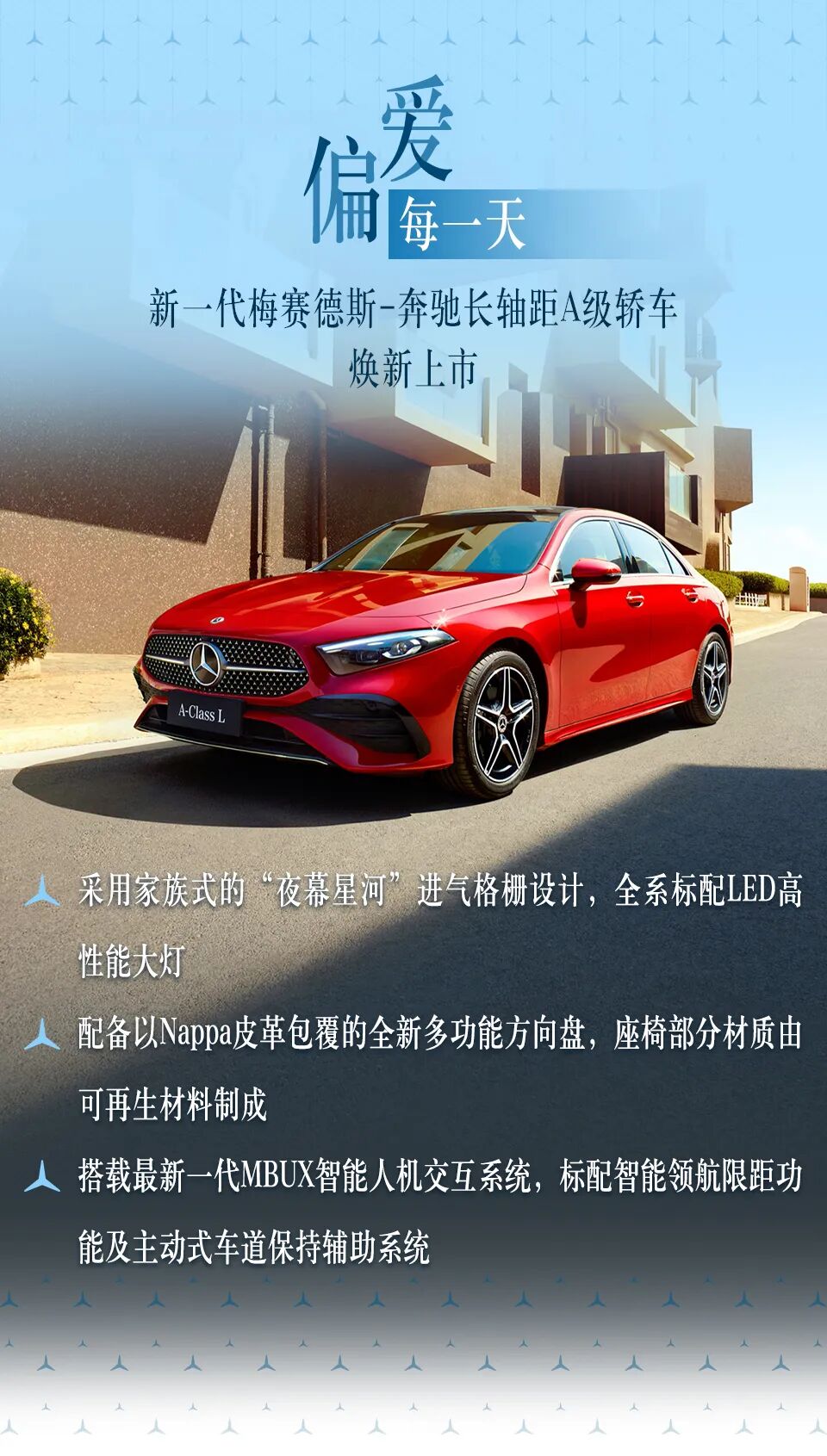 新生代豪华轿车的ICON与时俱进,新一代梅赛德斯-奔驰长轴距A级轿车承载诸多梅赛德斯-奔驰家族豪华设计与最新科技,为新生代客户带来迭代“偏爱”体验,以更高颜值、更加舒适、更新智能,偏爱每一天。
