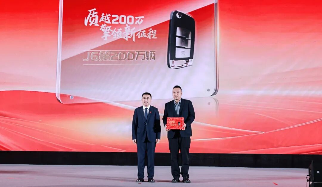 在J6平台产品第200万辆车的交付仪式上,一汽解放将象征荣耀与信赖的J6 PRO车钥匙交付给第200万辆J6车主——河北用户张雪柱。张雪柱作为解放品牌的传承客户,在煤炭运输领域深耕多年,名下拥有80余辆解放卡车。