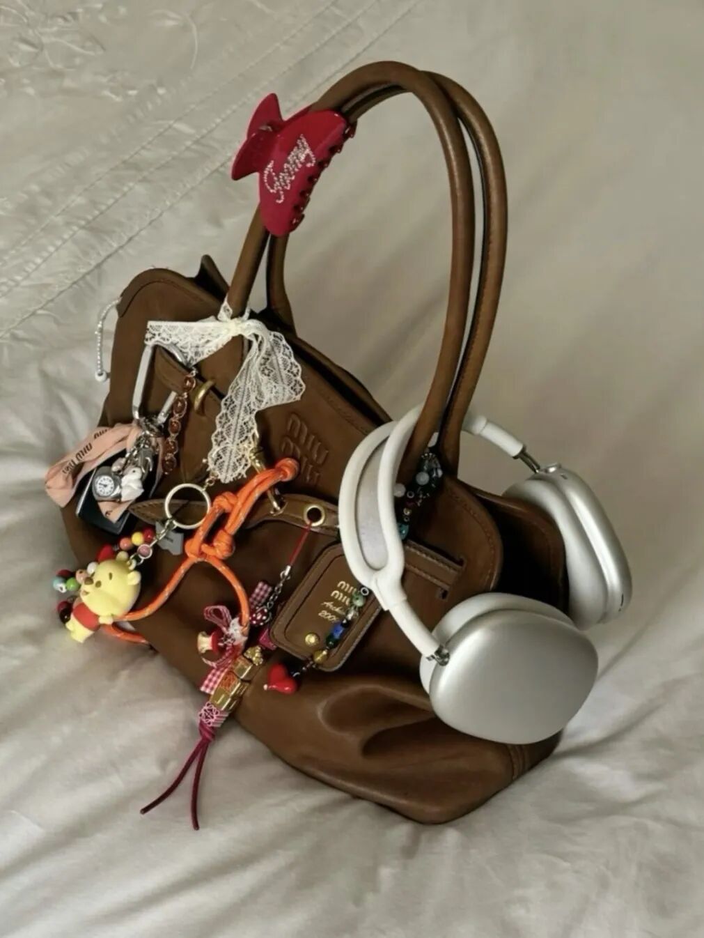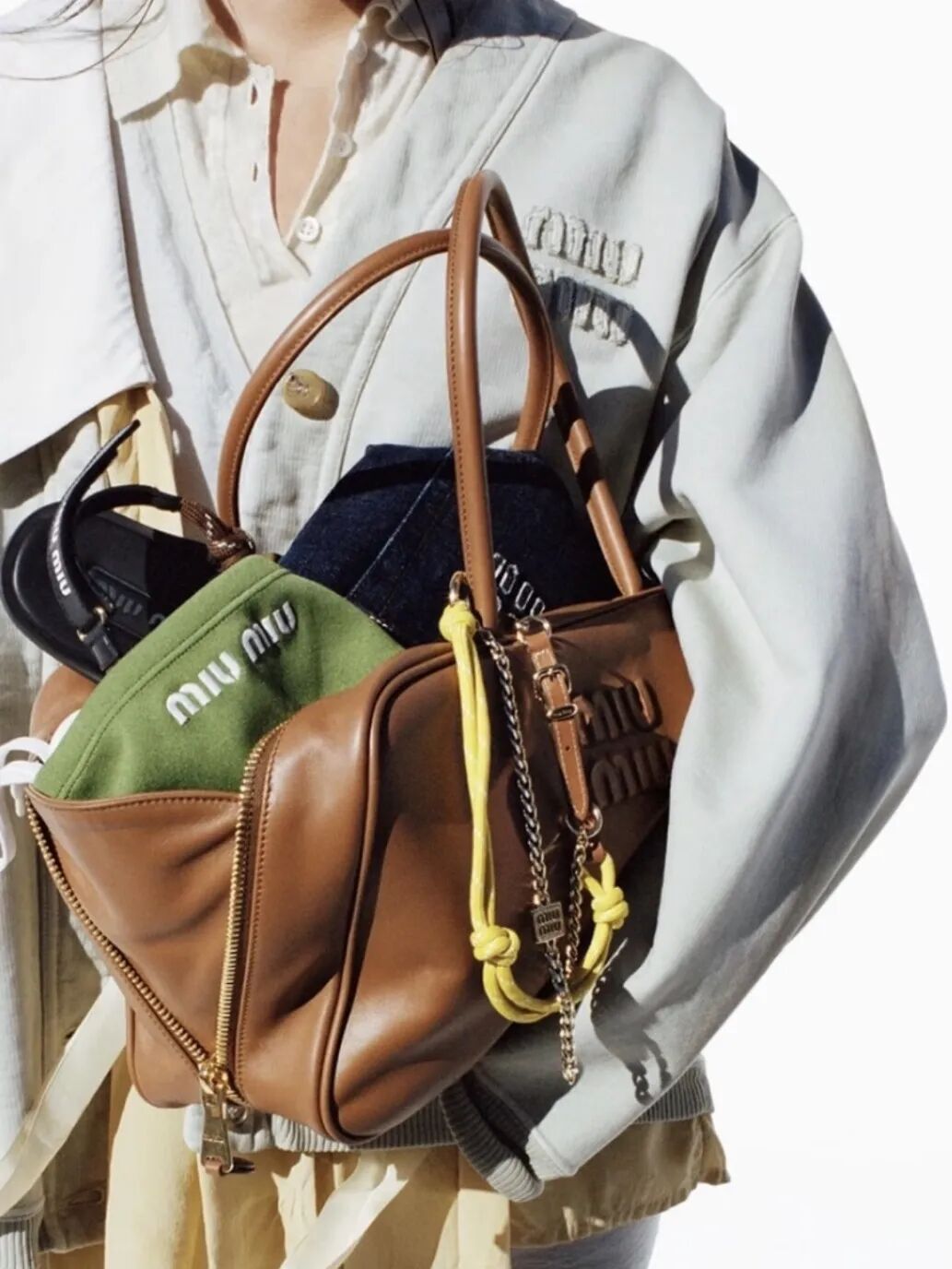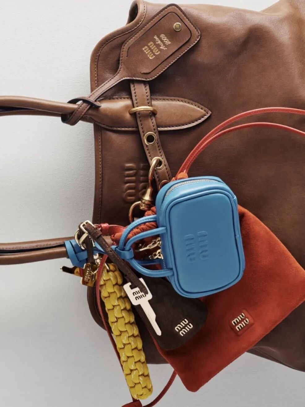 Miu Miu将经典保龄球包与高亮彩色尼龙绳结相结合的创意,如同鬼马少女的内心独白——明快、缠绵又充满多面性。这一设计不仅引爆了包挂时尚,甚至催生出一个庞大的“平替Miu风尼龙绳”产业,证明了其强大的潮流辐射力。