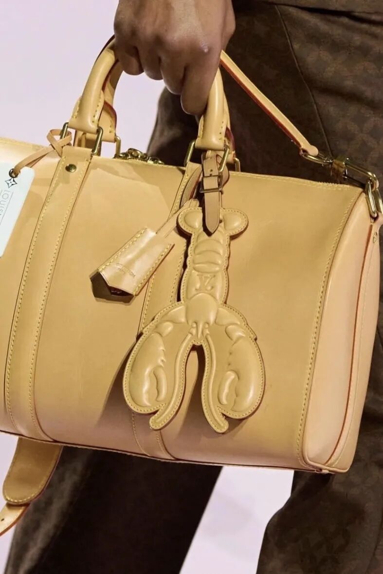 Louis Vuitton在2025秋冬系列中推出了令人惊艳的龙虾与饺子造型包挂。以顶级皮革精心缝制,配以精致的金属配件,将日常食物转化为奢侈配饰。