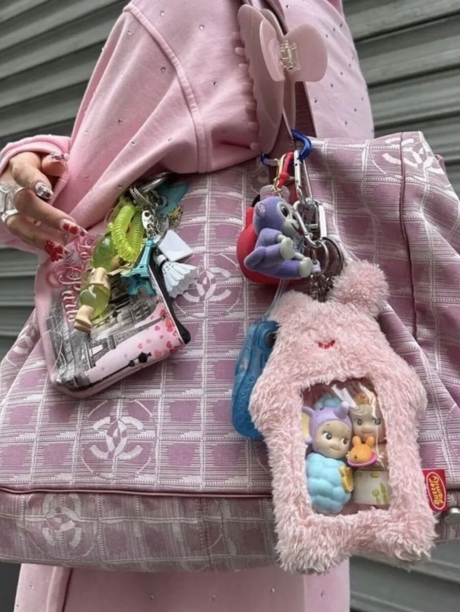 Y2K风格的"彩色杂物美学"将千禧年的怀旧元素与现代时尚巧妙融合。亮片串珠、透明材质、彩虹挂件……各种鲜艳夺目的小物件被大量堆叠在包上,形成一种看似杂乱实则精心策划的视觉冲击。这种风格不仅是对千禧年审美的追忆,更是当代年轻人拒绝被定义的叛逆表达。