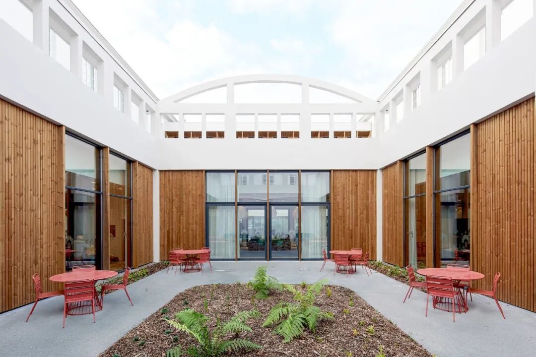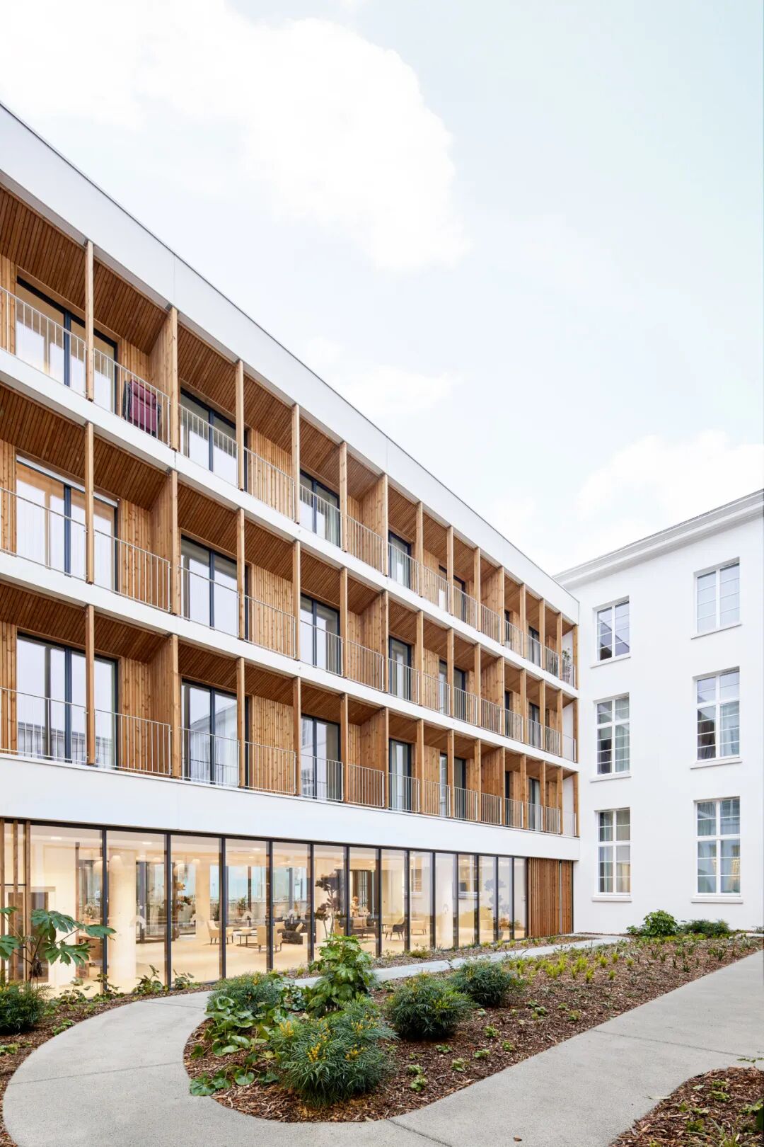 Chatillon Architectes将法国布雷斯特一座建于 20 世纪 50 年代的邮局,改造为现代化老年公寓。项目通过对历史建筑的修复、新建附属翼楼与打造内部花园,展示了如何对城市历史建筑进行适应性改造,以满足老龄化人口的居住需求。 © Antoine Mercusot