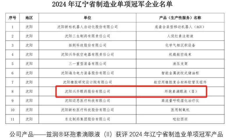 3月,公司产品——兴齐®美欧品®0.01%硫酸阿托品滴眼液正式获得国家药品监督管理局的上市批准;4月,公司荣获中国医药包装协会颁发的“标准化工作贡献单位”;5月,兴齐眼药研发中心建设项目奠基仪式圆满举行,公司被国家知识产权局评选为“国家知识产权局审查员实践(沈阳自贸区)基地沈阳兴齐眼药股份有限公司实践点”;6月,公司获批成立“中国医药包装眼用制剂包装研究中心”;7月,荣获沈阳市委人才工作领导小组颁发“国家科技创新平台业绩突出”奖项;10月,公司产品——兹润®环孢素滴眼液(Ⅱ)获评2024年辽宁省制造业单项冠军产品;11月,公司产品——兹润®0.05%环孢素滴眼液(Ⅱ)获批入选中国眼表与泪液领域的十大标志性事件。