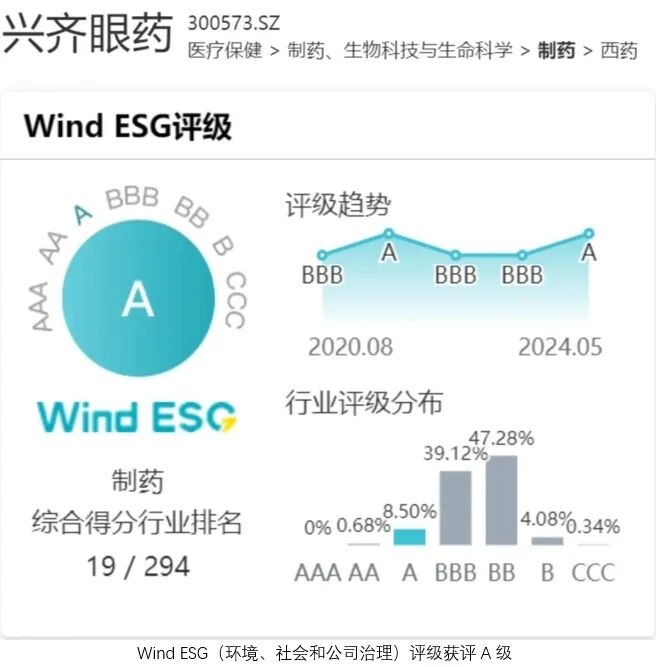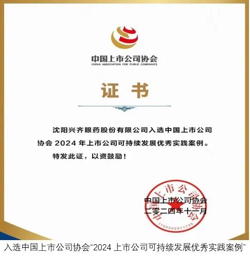 以全面质量管理促进发展质量提升,为公司高质量发展蓄势赋能。5月,被中共辽宁省委、省政府颁发的“全面振兴新突破三年行动首战之年突出贡献”称号,Wind ESG(环境、社会和公司治理)评级获评A级;9月,公司被辽宁省质量强省工作领导小组办公室授予“卓越质量管理创新推广平台”,荣获2023年度全景投资者关系金奖“杰出IR公司奖”;10月,兴齐眼药荣获深交所信息披露A级评价,公司参加第45次全国医药行业QC小组成果发表交流会并斩获多项荣誉;11月,兴齐眼药入选中国上市公司协会“2024上市公司可持续发展优秀实践案例”。