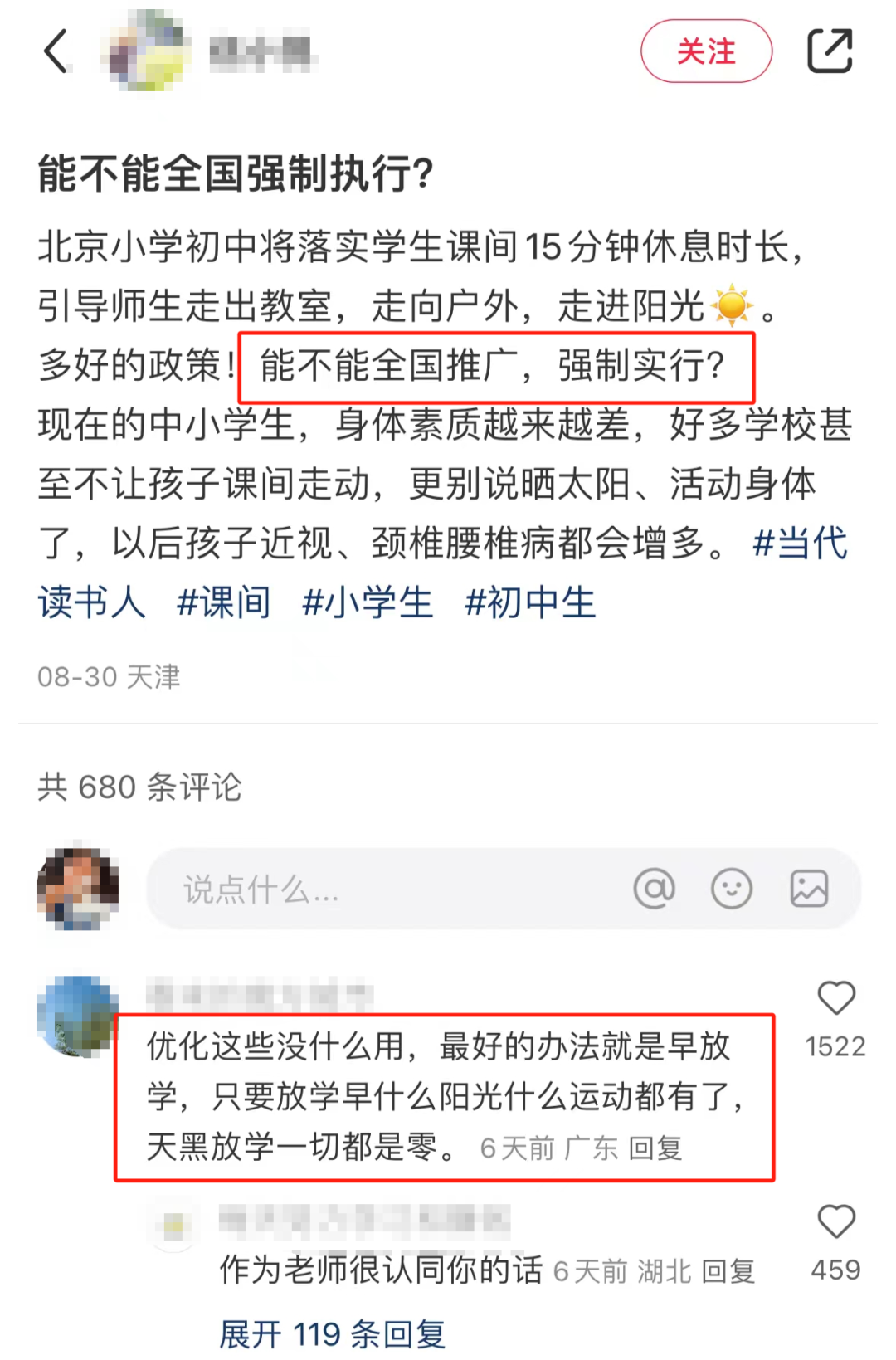 然而几家欢喜几家愁,部分家长非常高兴课间时间的增长,孩子可以增加一点休息时间;部分家长却有点担心,上下学时间不变,课间时间增长会不会影响孩子的学习进度?