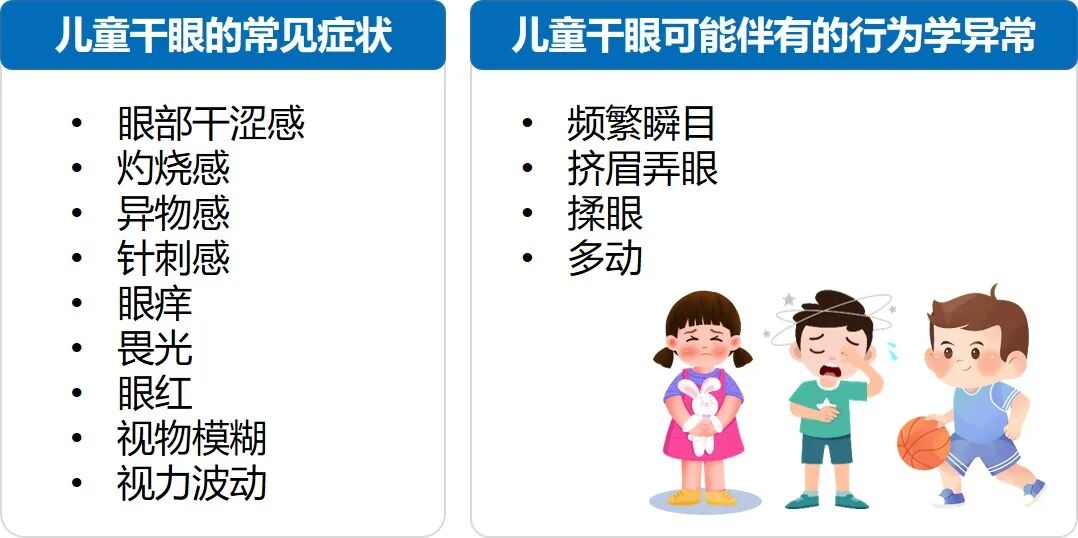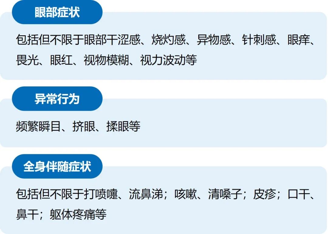 儿童干眼的常见症状与成人干眼相似。不同之处在于,儿童对症状的表述常不够清楚,也不够准确,需特别关注儿童的行为学异常1(图3)。